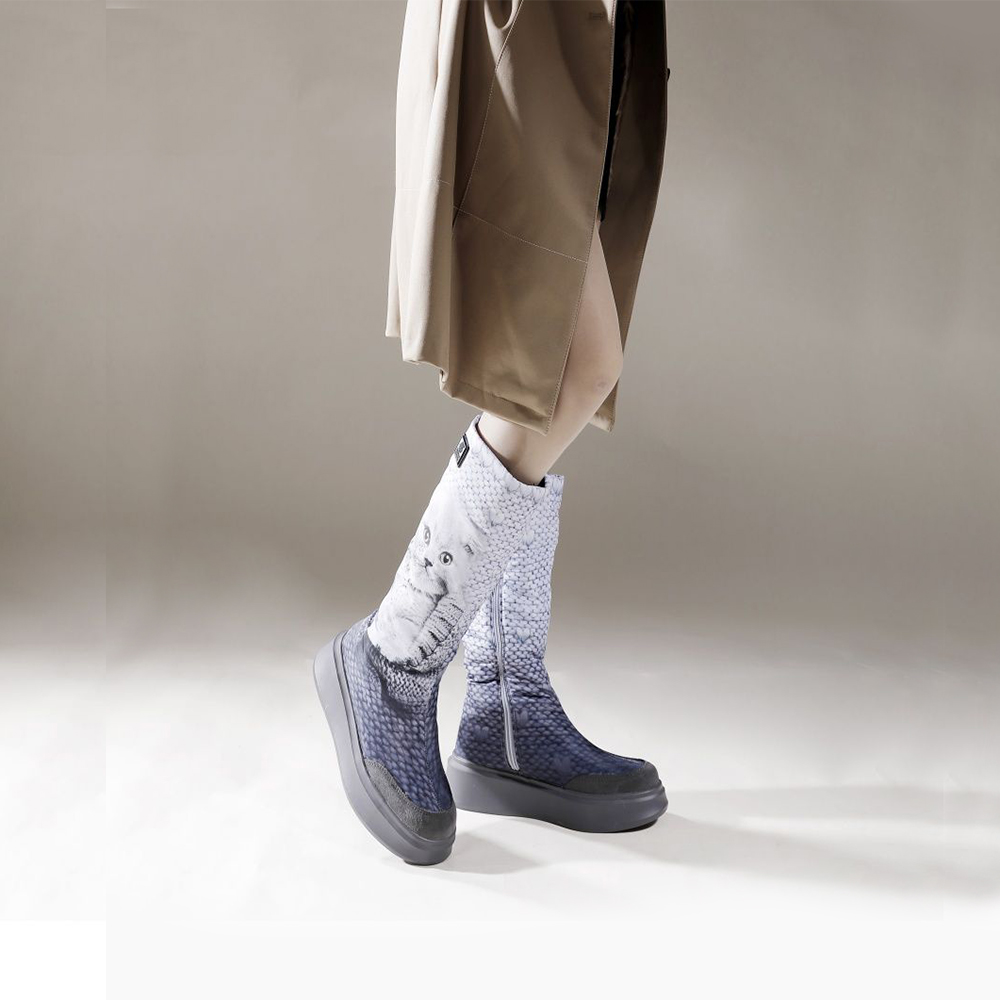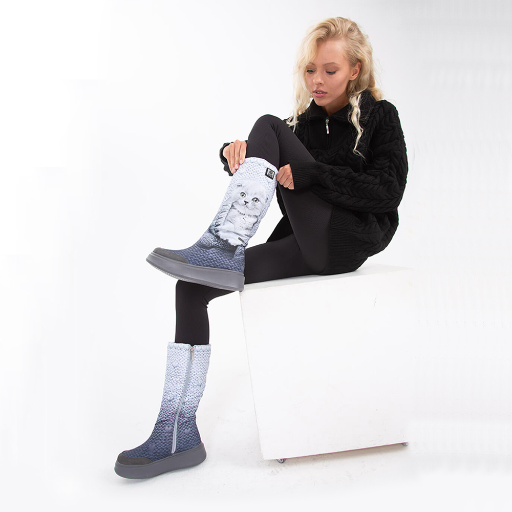 Необычные женские дутики на молнии от KING BOOTS - это модная и невероятно удобная обувь для зимы и морозного демисезона. Непромокаемые и очень теплые, они подходят как для города, так и для активных прогулок на природе. Удобная посадка на ногу и широкий выбор размеров - все это делает наши изделия отличным выбором для любой современной женщины, молодой девушки или девочки - подростка. Водоотталкивающий материал верха - высококачественный нейлон и мембрана KING-TEX, которая не только не пропускает влагу снаружи, но и предотвращает запотевание. Она выводит водяной пар наружу через микроскопические поры. В таких сапожках гарантированы сухость ног, комфортная температура и никакой сырости даже во время прогулок по снегу. За счет мембраны обеспечивается максимально эффективная защита от воды и мороза. Среди особенностей модели можно выделить мысок из натуральной замши, легкую и высокую подошву. Толстая шерстяная подкладка и стелька гарантируют комфорт во время носки. Эти красивые зимние дутики украшены авторским рисунком милого котенка. Стильные модели с удлиненным голенищем и натуральной шерстяной подкладкой - это водонепроницаемая обувь, отлично подходящая для активного использования в очень холодную погоду до -20 градусов. Эта обувь будет отлично гармонировать с классической одеждой. Наши мягкие сапоги с принтом кошки подходят для активного и дачного отдыха, спорта на природе и станут настоящей находкой для мам, долго прогуливающихся на улице с коляской даже в сильный мороз. Дутики созданы с использованием тщательно отобранных материалов, адаптированы для суровой зимы. Текстильная модель от немецкой фирмы - это красивая и практичная обувь для зимы. Высокие сапоги с кошкой практичны для активных тренировок и сноуборда. Дутыши с длинным голенищем подойдут на стопу любой полноты: и на узкую, и на широкую. Влагостойкие сноубутсы будут удобны для туристических походов и для рабочих нужд. Эта повседневная и спортивная обувь на легкой платформе подарит комфорт при носке.
