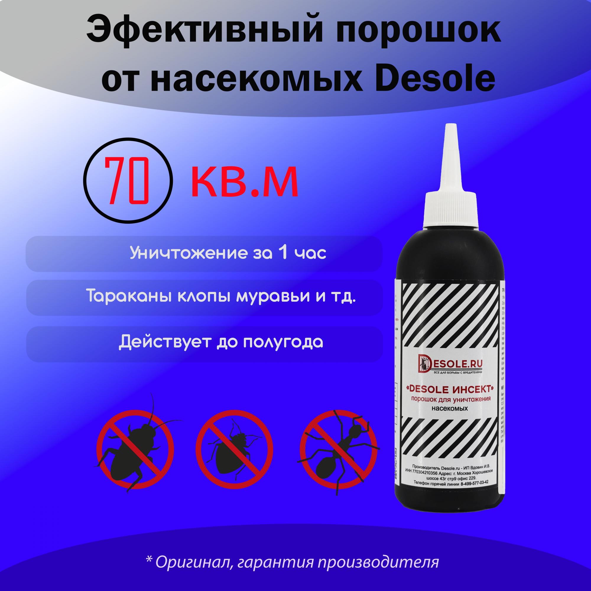 Гарантируем эффективность или ВЕРНЁМ ВАМ ДЕНЬГИ. Порошок для уничтожения насекомых «Desole инсект» - это двухкомпонентное инсектицидное средство, эффективно уничтожающее любых насекомых: тараканов, клопов, муравьев, мухи, моль и тд. Порошка достаточно на 40-70 кв.м обрабатываемой площади