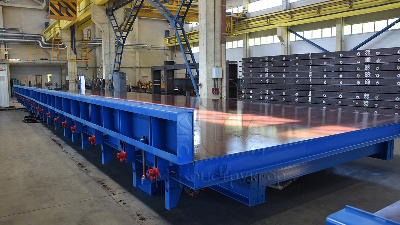 При необходимости оборудование ЖБИ (столы) объединяют в линию нужной длины. Вибростолы оснащаются гидростанцией, вибратором, телескопическими цилиндрами, тепловыми регистрами, бортами, предохранительными цепями, шкафом и пультом управления.