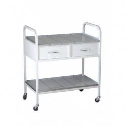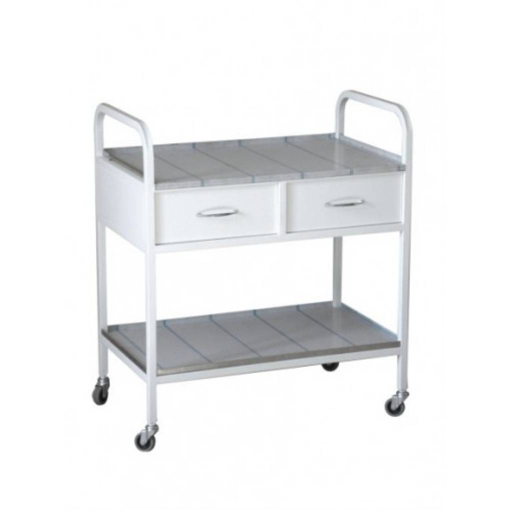 В верхней части 2 выдвижных ящика, в нижней металлическая полка. Столешница и полка из нержавеющей стали крепится к каркасу на заклепки. Столик установлен на 4 колеса d 50 мм. Все металлические поверхности имеют полимерно-порошковое покрытие. Столик поставляется в собранном виде.