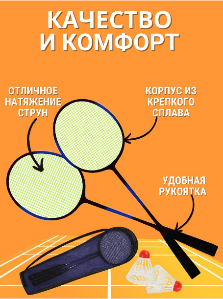 В комплекте имеется 2 ракетки для бадминтона, 1 чехол и воланы. Упаковка имеет следующие габариты: длина - 67 см, высота - 22 см, ширина - 4 см. Производитель - Китай.