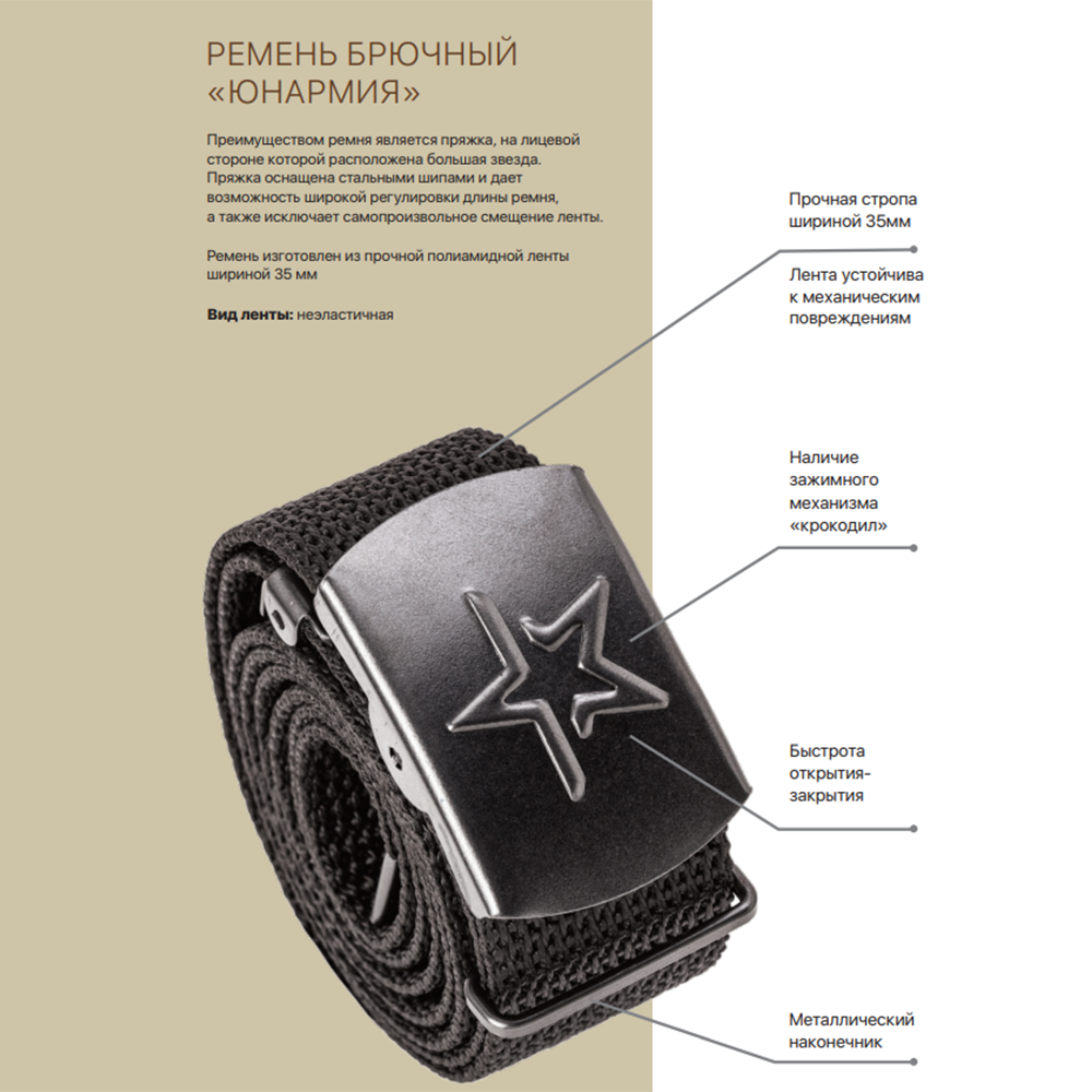 Ремень брючный «ЮНАРМИЯ» имеет простой принцип фиксации, надежен и удобен в эксплуатации. Ременная пряжка, как и другие элементы ремня изготовлены из холоднокатаной стали методом штамповки. Покрытие — химическое оксидирование с промасливанием, для обеспечения высокого уровня коррозионной стойкости. Регулировка ремня и фиксация происходит методом заклинивания ленты в пряжке. Данное изделия прекрасно подходит для подростков и людей готовых получать максимальный комфорт, при минимальных затратах!