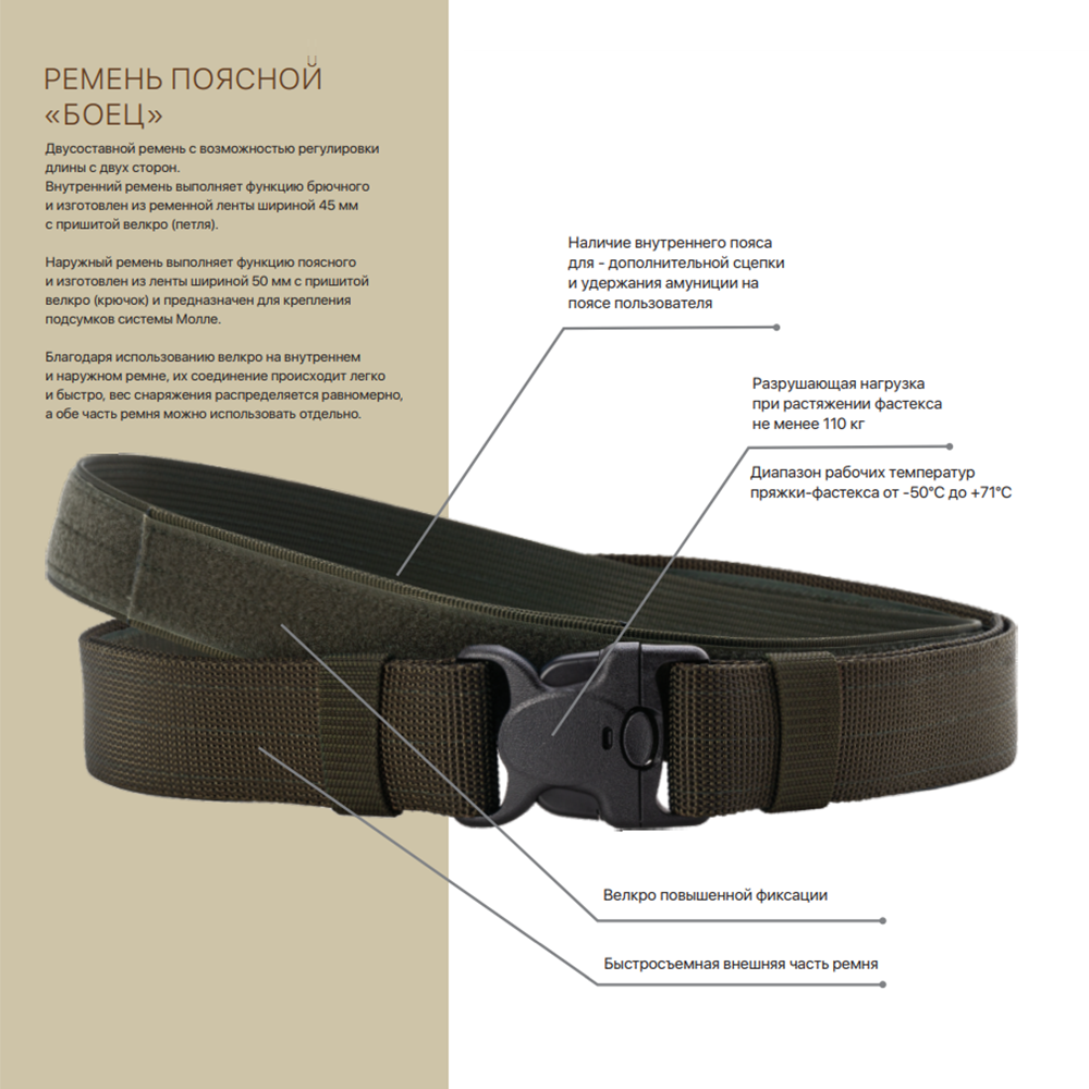 Ремень поясной «БОЕЦ»- это многофункциональное и высококачественное изделие для боевых подразделений и силовых структур! Данные ремень является двусоставным с возможностью регулировки длины обеих частей и возможностью использования каждой из частей ремня отдельно от другой! Внутренний ремень выполняет функцию брючного ремня и изготовлен из ременной ленты шириной 45 мм с пришитой велкро (часть ленты содержащей крючок). Наружный ремень выполняют функцию поясного ремня и изготовлен из ленты шириной 50 мм с пришитой велкро (часть ленты содержащей петлю), он так же предназначен для крепления подсумков системы Mолле. Благодаря использованию велкро внутренний и наружный ремни легко и надежно соединяются, а вес снаряжения равномерно распределяется на обе части ремешка.