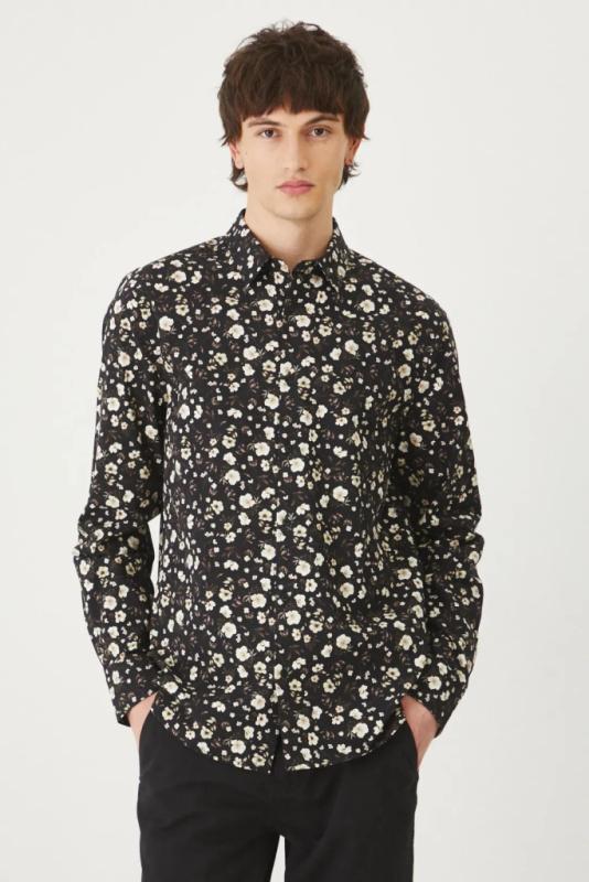 Рубашка приталенного кроя, выполнена из ткани с мелким цветочным узором и имеет классический, слегка жесткий воротник.