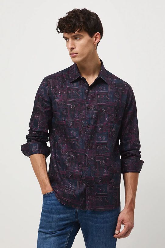 Главная особенность этой рубашки – ткань с принтом. Оригинальный и стильный, он делает эту рубашку отличным выбором для тех, кто хочет выделиться из толпы и добавить красок в свой гардероб.