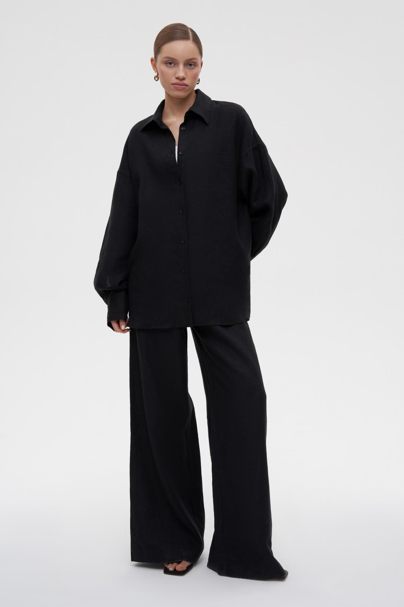 Рубашка свободного кроя с длинным рукавом и отложным воротником изо льна. Изделие имеет нагрудный карман и спереди застегивается на череду пуговиц. Рубашка имеет небольшой перепад высоты между полочкой и спинкой, декоративную кокетку сзади и складки для придания большего объема. Прямой крой обеспечивает свободную посадку и комфортное ношение. Необходим деликатный уход.