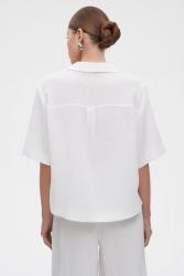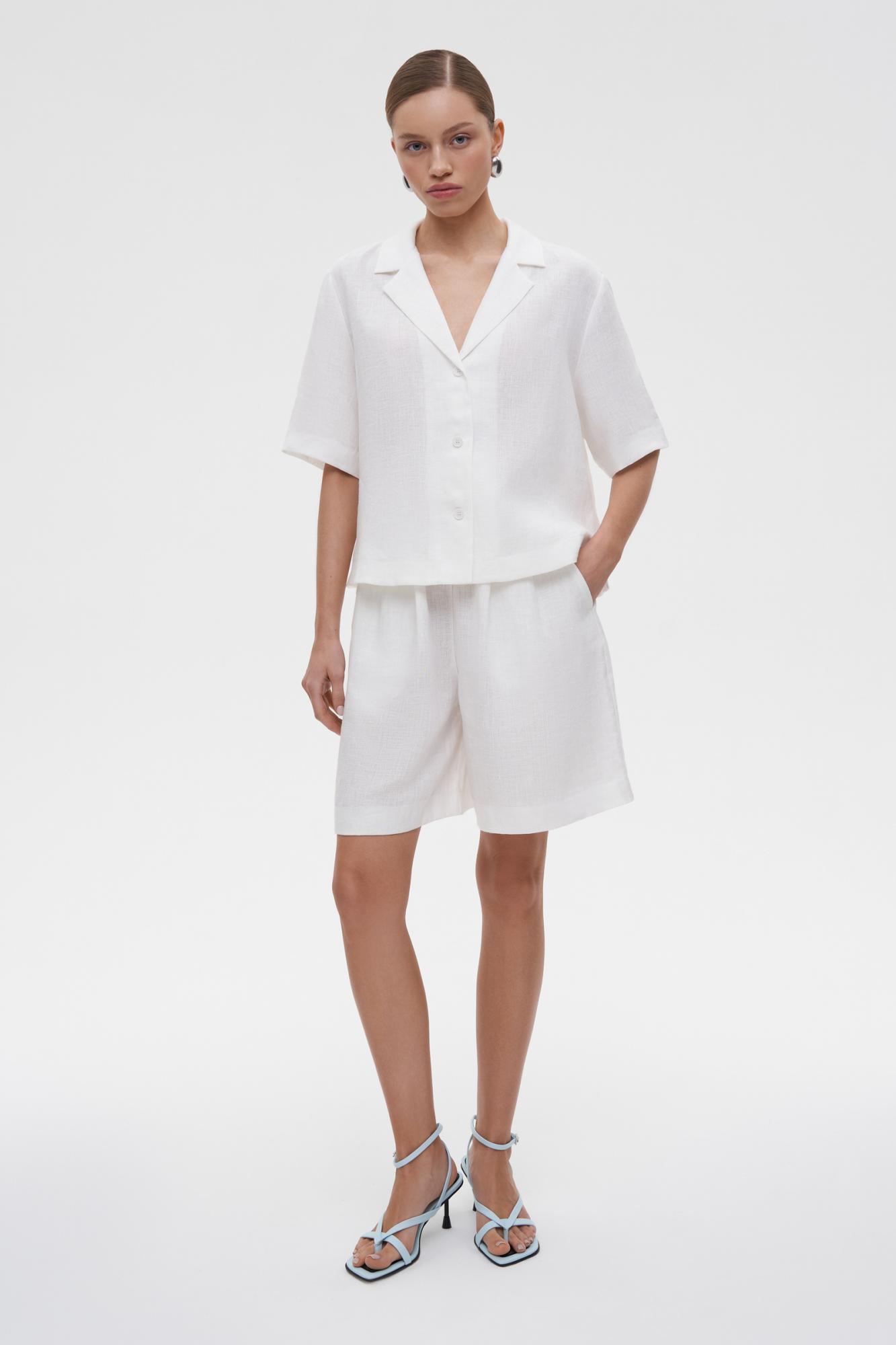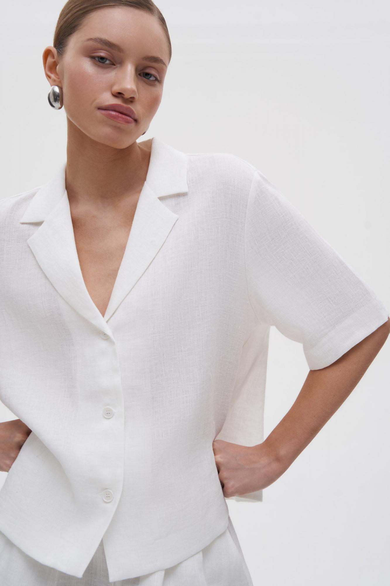 Укороченная рубашка с коротким рукавом и строгими лацканами. Универсальное изделие для легких повседневных выходов. Точный и прямой силуэт, приспущенное плечо обеспечивают комфортную посадку. Классический крой дополнен акцентными классическими лацканами, что делает модель удачной для составления любых образов. Расслабленности изделию добавляет перепад длины между полочкой и спинкой. Идеальный тандем силуэта и ткани. Требуется бережный уход.
