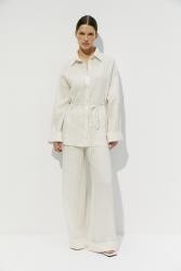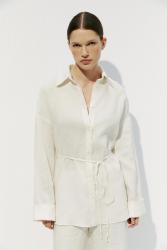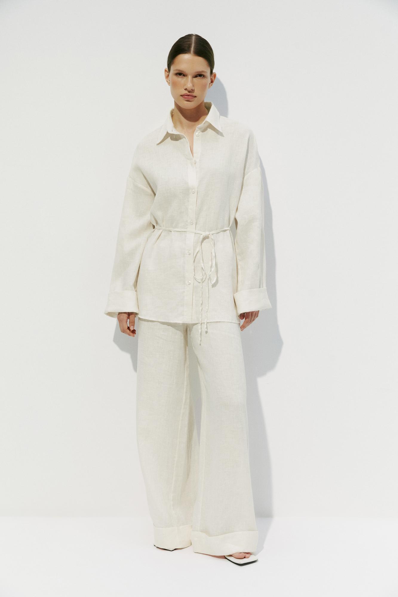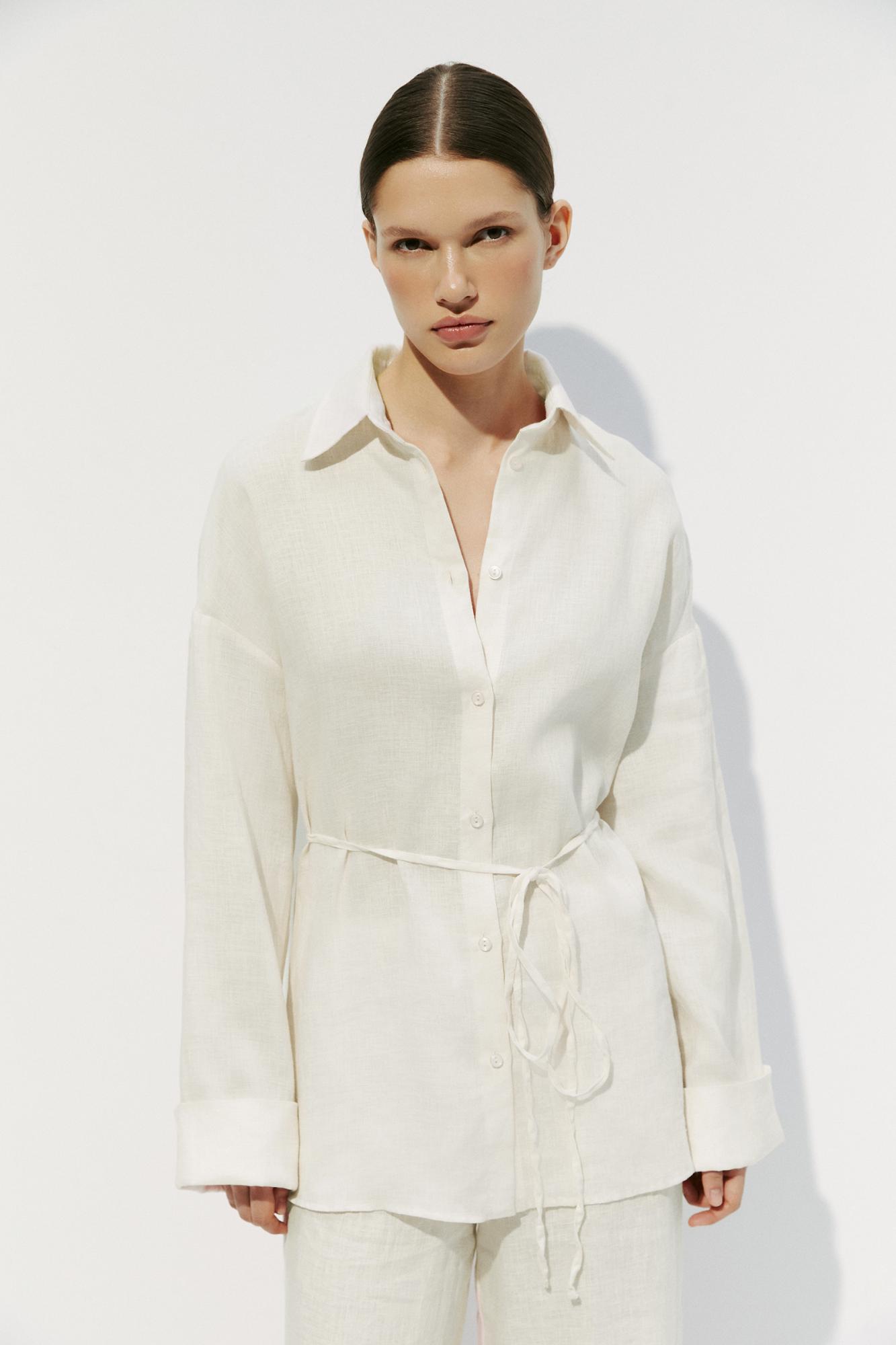 Рубашка изо льна с длинным рукавом. Модель выполнена с комфортной посадкой со спущенным плечом. Нежность изделия гармонично сочетается с классическим отложным воротником и кокеткой. Рубашка застегивается на череду пуговиц и имеет боковые разрезы в швах. Особенным является тонкий пояс, которым можно подчеркнуть талию и высокие манжеты.