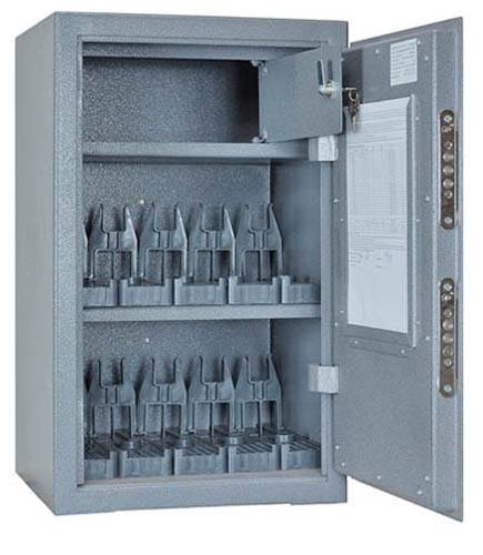 Модель ОШ-10ПУ востребована в охранных фирмах, армейских оружейных, системе МВД. Он предназначен для хранения 10 пистолетов типа ПМ, Кедр и т.д. Отвечает всем требованиям МВД к хранению огнестрельного оружия. Оборудован устройством для опечатывания. Изделие прошло сертификацию на взломостойкость в соответствии с ГОСТ Р 51113-97. Имеется, запираемое на дополнительный замок, патронное отделение и полка. Сейф укомплектован десятью универсальными ложементами под пистолеты, что позволяет пистолеты-пулеметы с увеличенными обоймами. Изнутри дверцы предусмотрена рамка под список пользователей служебного оружия. Цена сейфа пистолетного доступная, т.к. интернет-магазин напрямую сотрудничает с производителями специализированной мебели.
