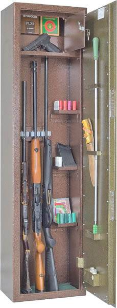 Сейф оружейный односекционный ОШ-4 сертифицирован на устойчивость к взлому по ГОСТ Р 50862-2005 п.п. 5.1., 5.2. и соответствует классу Н0 (ниже нулевого) устойчивости к взлому. На задней стенке корпуса расположены отверстия для крепления. Сейф односекционный, на 4 ствола оснащен съемными полками и отделением под патроны. Ложементы — металлические держатели с резиновыми роликами. Максимальная высота устанавливаемого оружия — 1350 мм. Два замка ЗАО «Про-Сам» г. Рязань или аналогичные замки другого производителя.