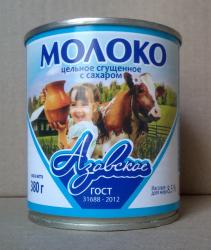 Молоко цельное сгущенное с сахаром "АЗОВСКОЕ". Массовая доля жира 8,5%. Молоко произведено по классической технологии без добавления растительных масел. Продукт произведен по ГОСТ 31688-2012.