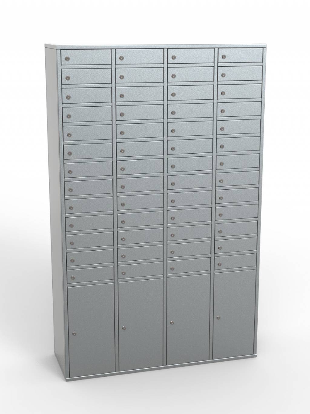 - Шкаф на 56 «глухих» ячеек под формат А4 без прорезей под корреспонденцию и сервисной двери;