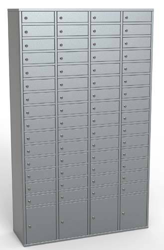 - Шкаф на 64 «глухих» ячейки под формат А4 без прорезей под корреспонденцию и сервисной двери;