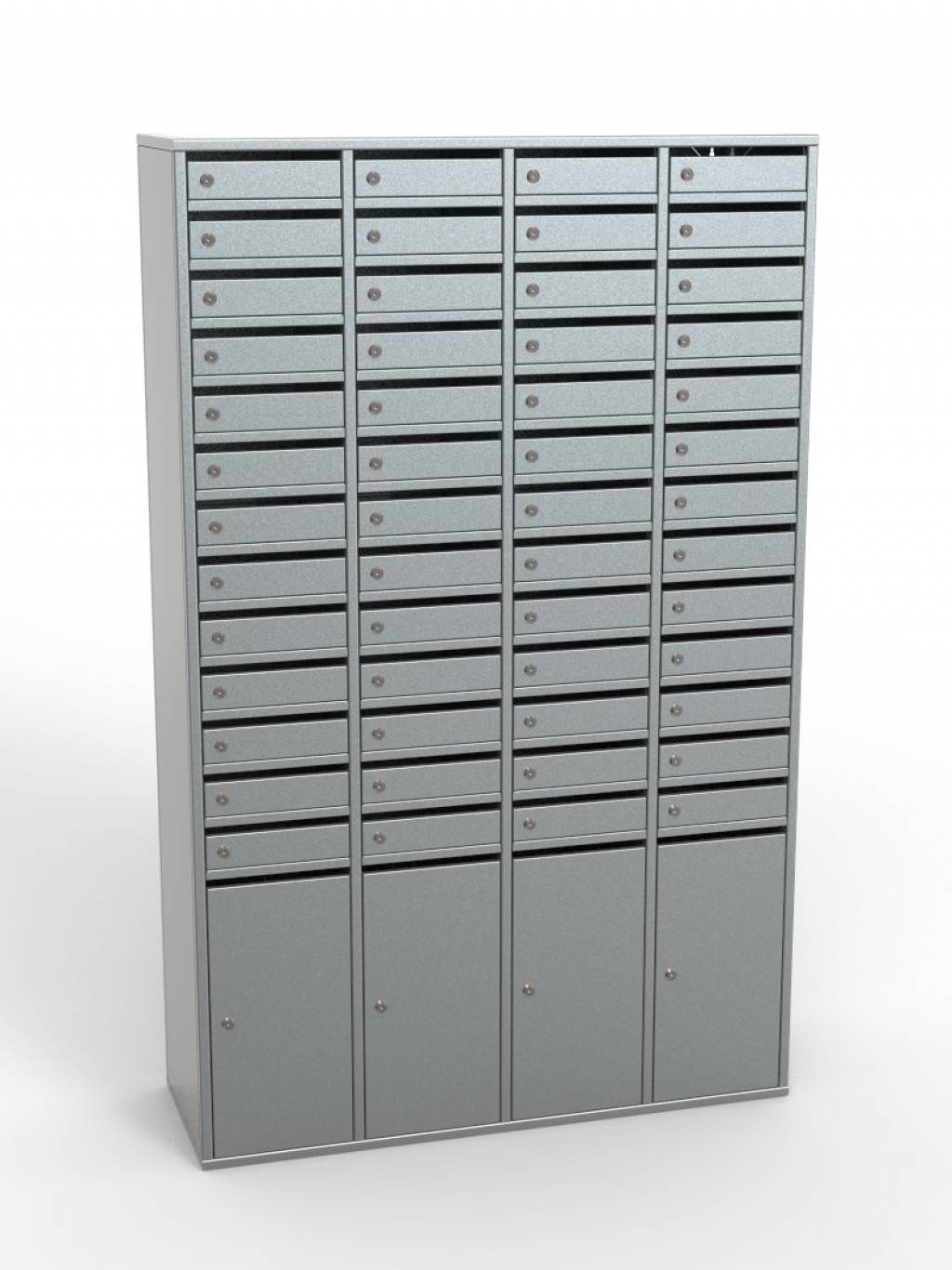 - Шкаф на 56 ячеек под формат А4 с прорезями под корреспонденцию;- Размер ячейки:- Маленькие (52 шт.) - 75х250х380 мм;- Большие (4 шт.) - 507х250х380 мм;- Каркас – профильная труба 20х20 мм;- Дверки и панели – 0,7 мм;- Замок – индивидуальный;