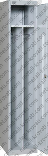 Тип: двухсекционный шкаф металлический с дверцами на два отделения, с полками, с перекладинами и крючками для одежды