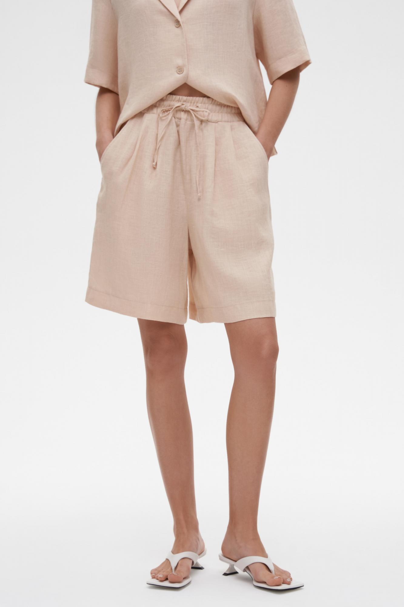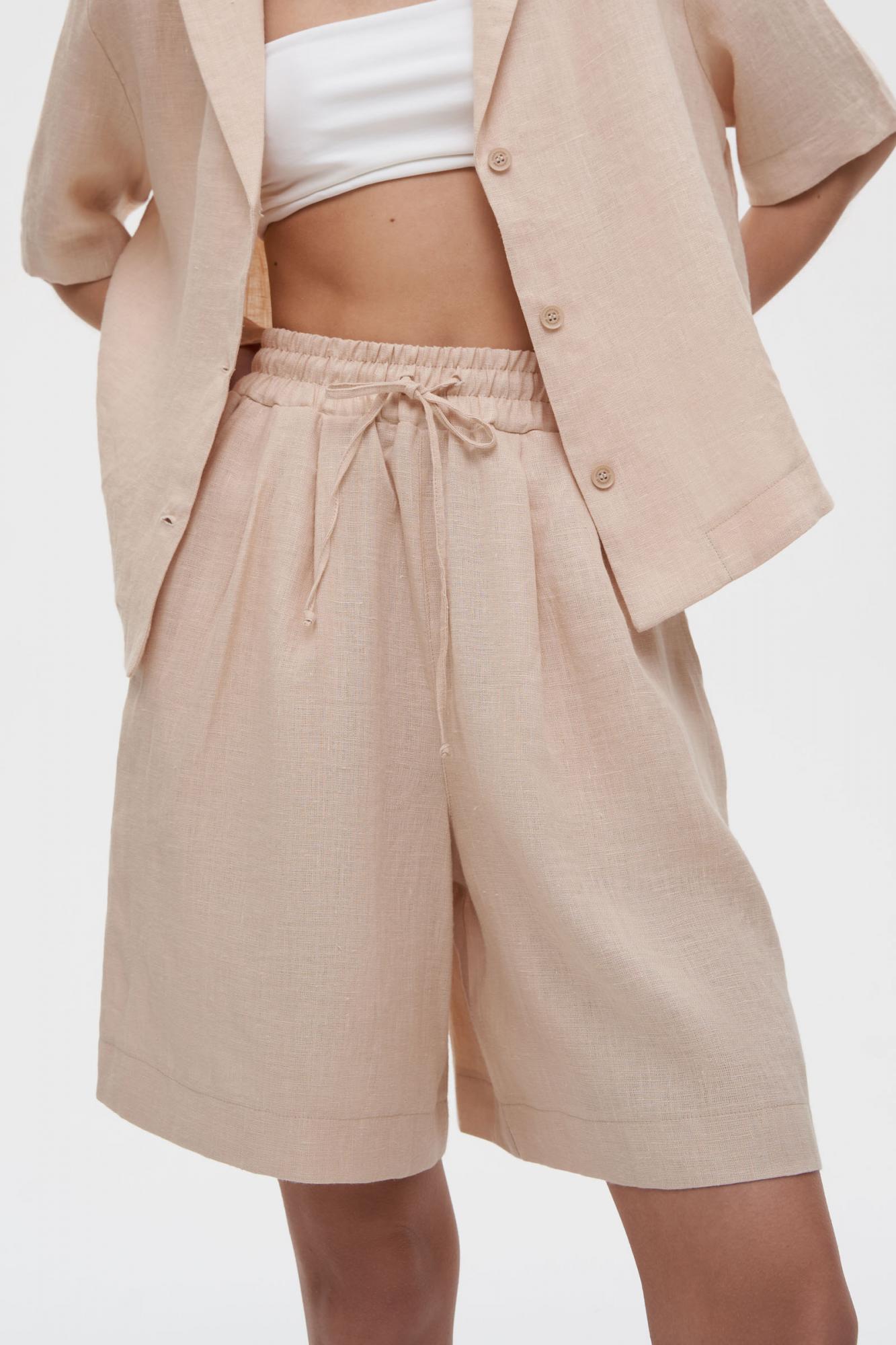 Шорты универсальной длины с завязками свободного кроя дополнены вместительными боковыми карманами. Мягкая широкая резинка и аккуратный силуэт обеспечивают комфортную посадку. Деликатные складки придают легкий и нежный объем изделию. Благодаря натуральной ткани в составе модель приятна телу, что особенно важно в летний период. Лён требует деликатного ухода.