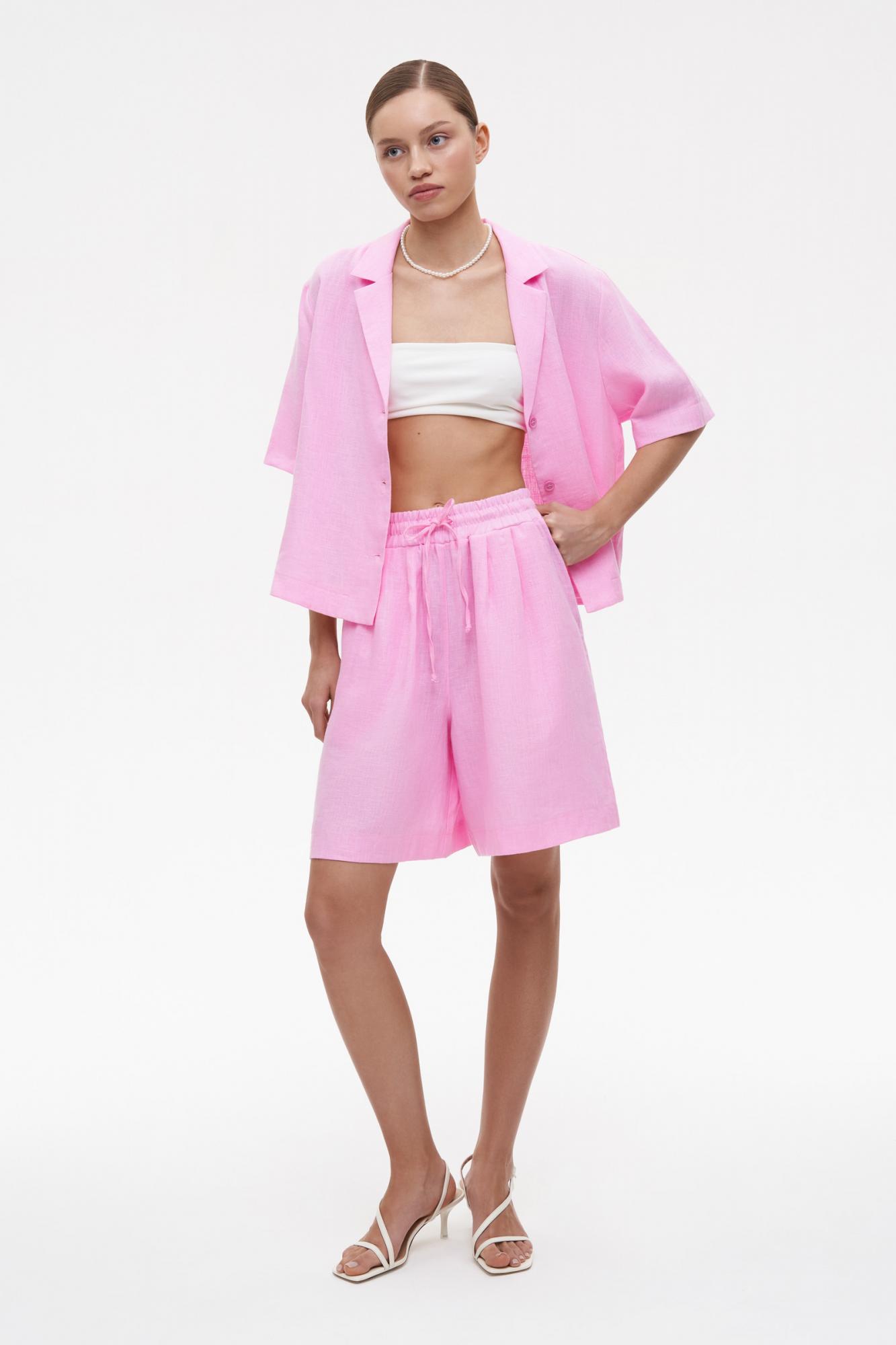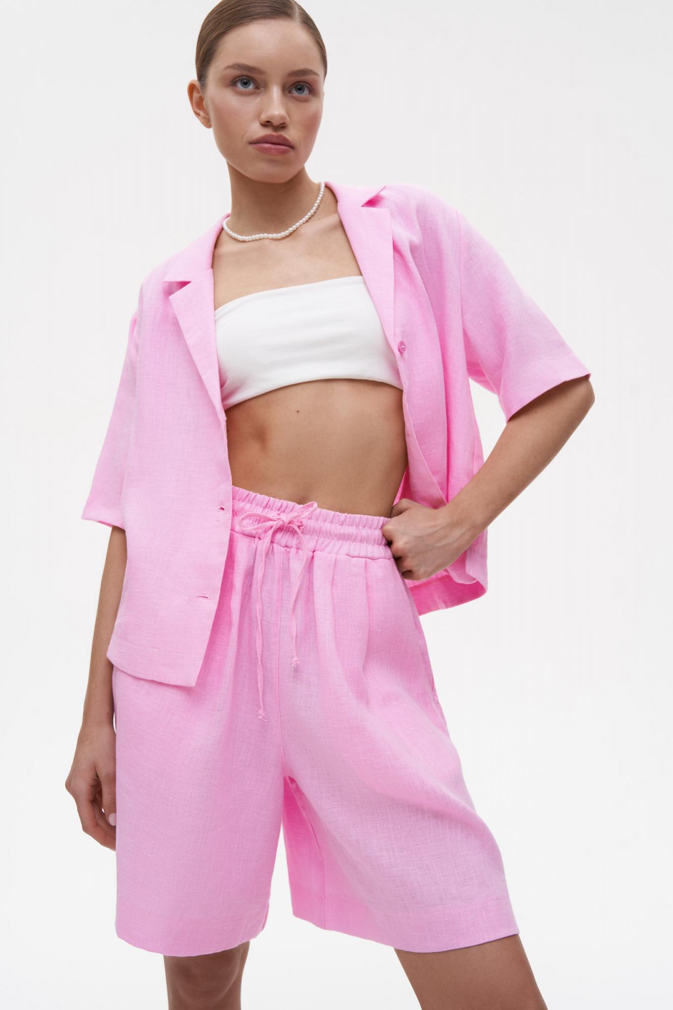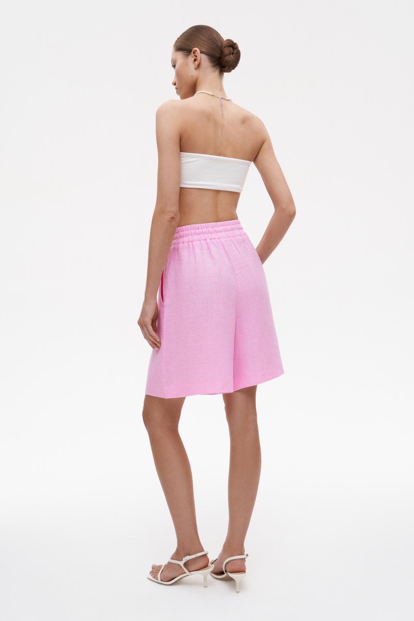 Шорты универсальной длины с завязками свободного кроя дополнены вместительными боковыми карманами. Мягкая широкая резинка и аккуратный силуэт обеспечивают комфортную посадку. Деликатные складки придают легкий и нежный объем изделию. Благодаря натуральной ткани в составе модель приятна телу, что особенно важно в летний период. Лён требует деликатного ухода.