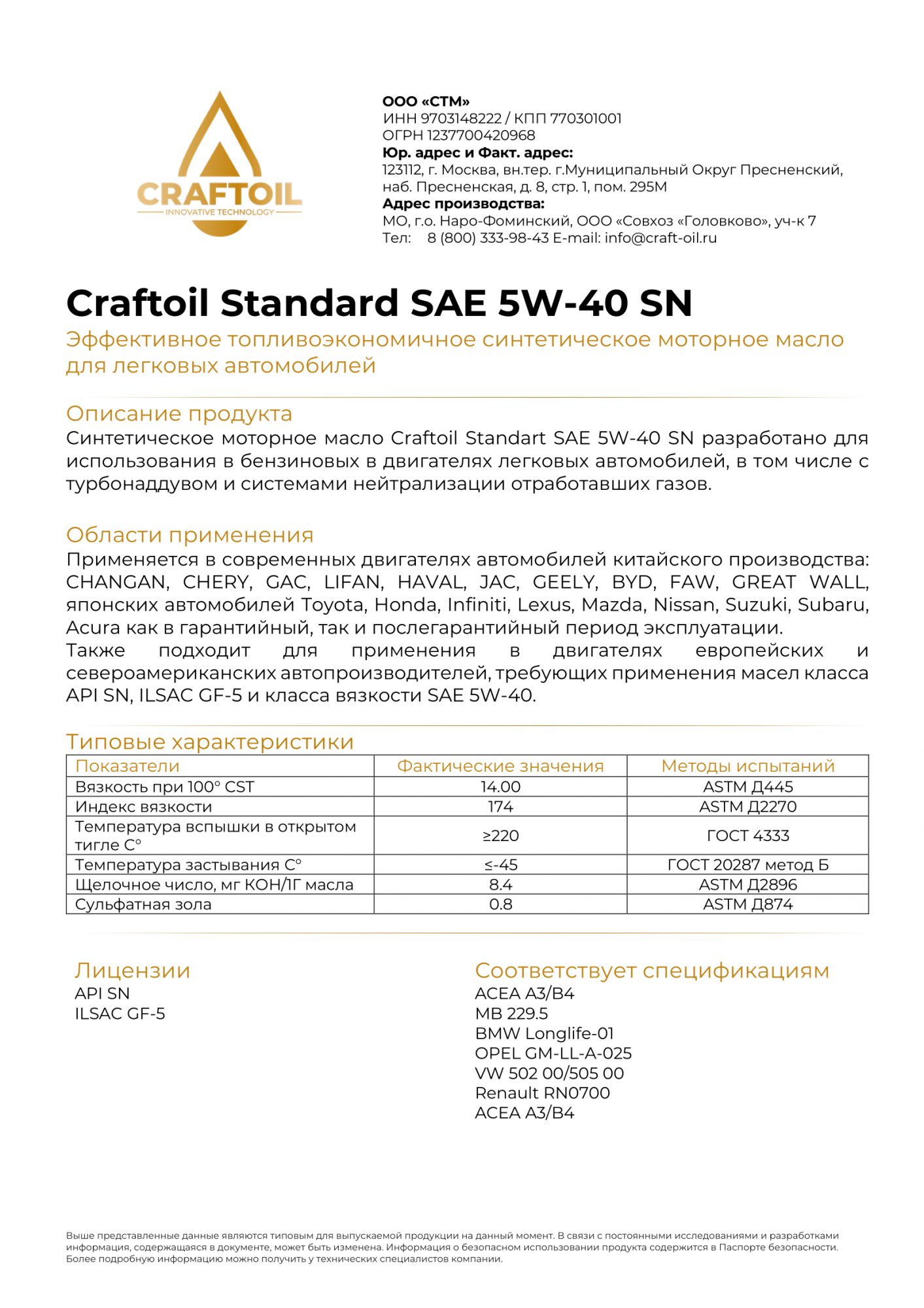 Infiniti, Lexus, Mazda, Nissan, Suzuki, Subaru, Acura — как в гарантийный, так и послегарантийный период эксплуатации. Craftoil Standart API SN также подходит для двигателей европейских и североамериканских автопроизводителей, требующих применения масел класса API SN,