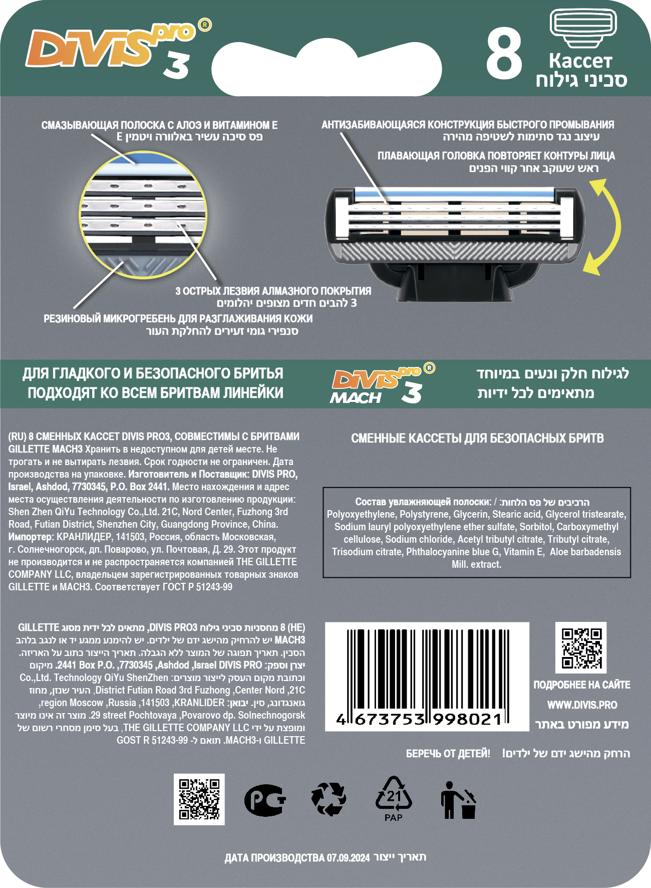 Закажите Аналог Gillette Mach3 Сменные кассеты для бритья DIVIS PRO3 сегодня и сделайте шаг к безупречной коже!