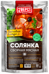 Огурец соленый, свинина, лук репчатый, картофель свежий, томатная паста, соль поваренная, сахар, вода, специи (паприка красная молотая, перец черный молотый, укроп сушеный, петрушка сушеная); сосиски (мясо птицы МО, эмульсия, шпик, крахмал, соль, манная крупа, стабилизатор Е450, Е451, Е452, специи Альми, усилитель вкуса Е621, антиокислитель Е300, ароматы экстрактов специй, фиксатор окраски Е250); бекон свинина, вода, соль нитритная (соль, фиксатор окраски - нитрит натрия), сахар, регуляторы кислотности (трифосфат натрия, ацетат натрия), стабилизаторы (полифосфат натрия, цитрат натрия 3-замещенный), сироп глюкозы, антиокислитель аскорбат натрия, усилитель вкуса и аромата глутамат натрия, специи (любисток, лук), экстракты специй (сельдерей, лук).