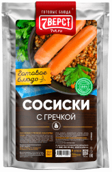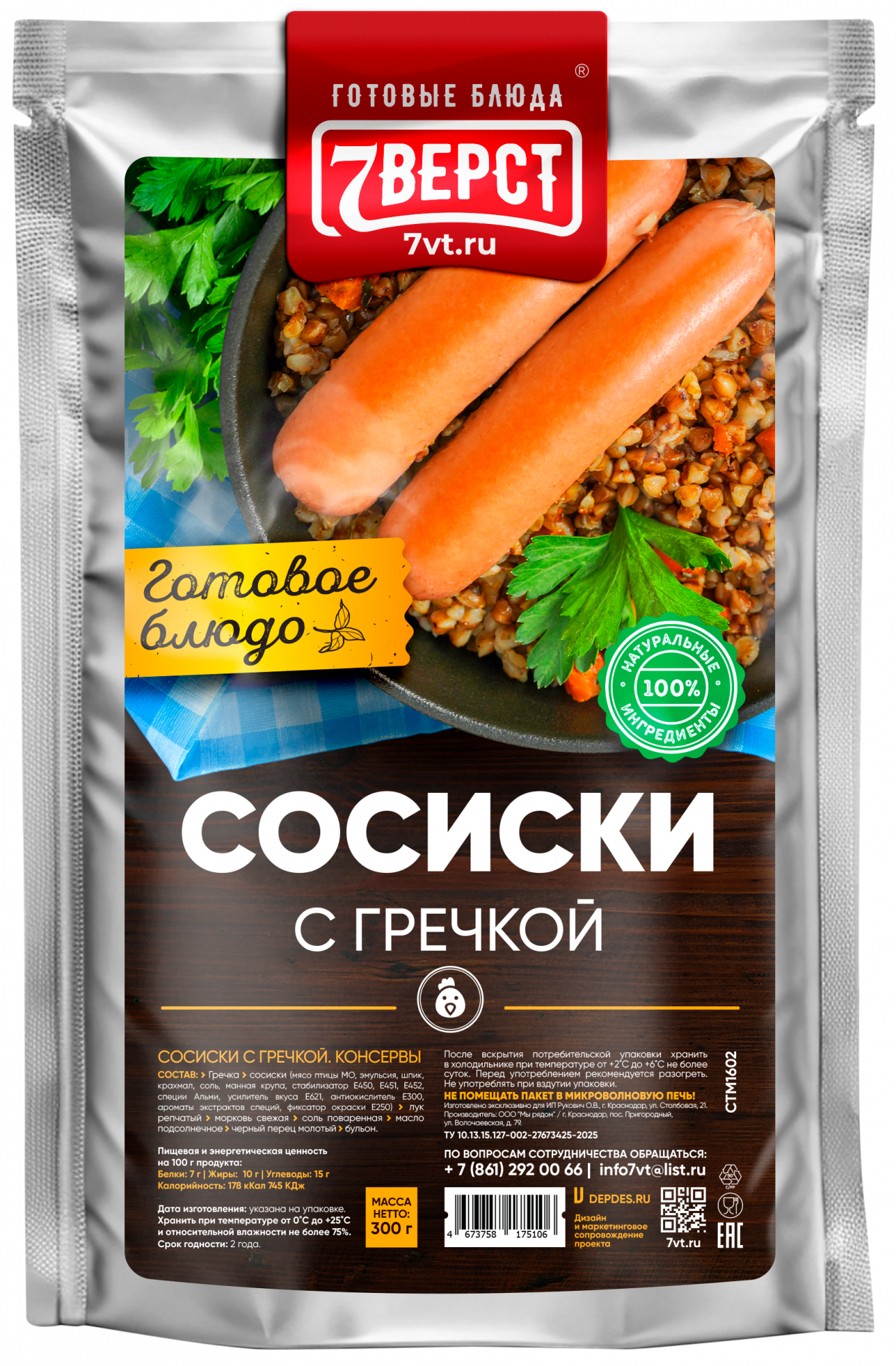 Гречка, сосиски (мясо птицы МО, эмульсия, шпик, крахмал, соль, манная крупа, стабилизатор Е450, Е451, Е452, специи Альми, усилитель вкуса Е621, антиокислитель Е300, ароматы экстрактов специй, фиксатор окраски Е250), лук репчатый свежий, морковь свежая, соль поваренная, масло растительное, вода, специи (кориандр, горчичный порошок, паприка красная молотая, чеснок молотый, орегано, сумах, перец красный чили молотый, мука рисовая, перец душистый молотый, лавровый лист молотый, черный перец молотый).