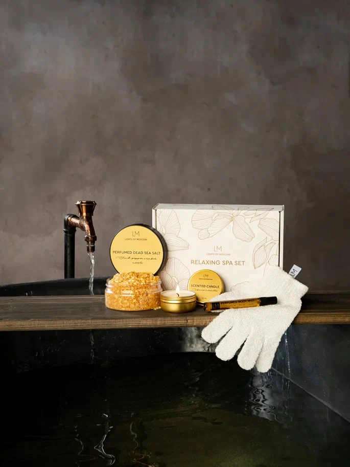 Парфюмированная ароматическая свеча из натурального соевого воска, парфюмированный спрей для тела в стеклянном янтарном флаконе, 100% парфюмированная натуральная кристаллическая соль для ванны, добытая из Мертвого моря.