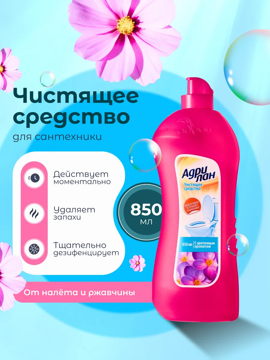 АДРИЛАН — это универсальное, эффективное и быстрое решение для уборки в ванной комнате и туалете. С учетом ежедневного использования этих помещений, мы понимаем важность качественной очистки от бактерий и загрязнений. Продукция АДРИЛАН очищает любые поверхности, включая эмалированные ванны, раковины и сантехнику, благодаря активным формам, которые расщепляют органические загрязнения и удаляют ржавчину. Специальные смачивающие агенты обеспечивают мгновенное действие, а легкие цветочные и фруктовые ароматы делают процесс уборки приятным. Выбирайте АДРИЛАН для чистоты и гигиены вашего дома!
