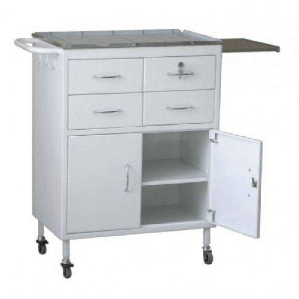- Основание изготовлено из трубы квадратного сечения, корпус и остальные элементы - из листового проката. - В корпусе имеются 4 выдвижных ящика, один из которых с замком. - Имеются 2 полки и 2 столешницы из нержавеющей стали, одна из которых выдвижная. - Полки закрыты дверцами. - Столик установлен на колеса d 50 мм, имеется ручка для удобства перемещения. - Все металлические поверхности имеют полимерно-порошковое покрытие. - Столик поставляется в собранном виде. - Продукция имеет Регистрационное Удостоверение Росздравнадзора и Сертификат соответствия.