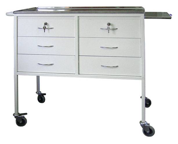 - Основание изготовлено из трубы квадратного сечения 20х20 мм, корпус и остальные элементы - из листового проката. - В корпусе имеются 6 выдвижных ящика, два из которых с замками. - Имеется столешница и выдвижная полка из металла. - Столик анестезиолога манипуляционный установлен на колеса d 50 мм, имеется ручка для удобства перемещения. - Все металлические поверхности имеют полимерно-порошковое покрытие. - Столик инструментальный поставляется в собранном виде.