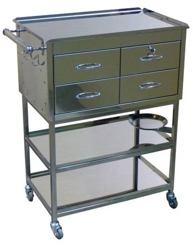 - Основание изготовлено из нерж. трубы квадратного сечения, корпус и остальные элементы - из зеркальной нерж. стали. - В корпусе имеются 4 выдвижных ящика, один из которых с замком. -Имеются 2 полки и 2 столешницы, одна из которых выдвижная. - Стол хирургический перевязочный установлен на колеса d 50 мм, имеется ручка для удобства перемещения. - Столик поставляется в собранном виде.