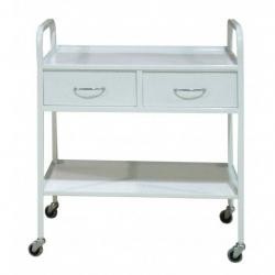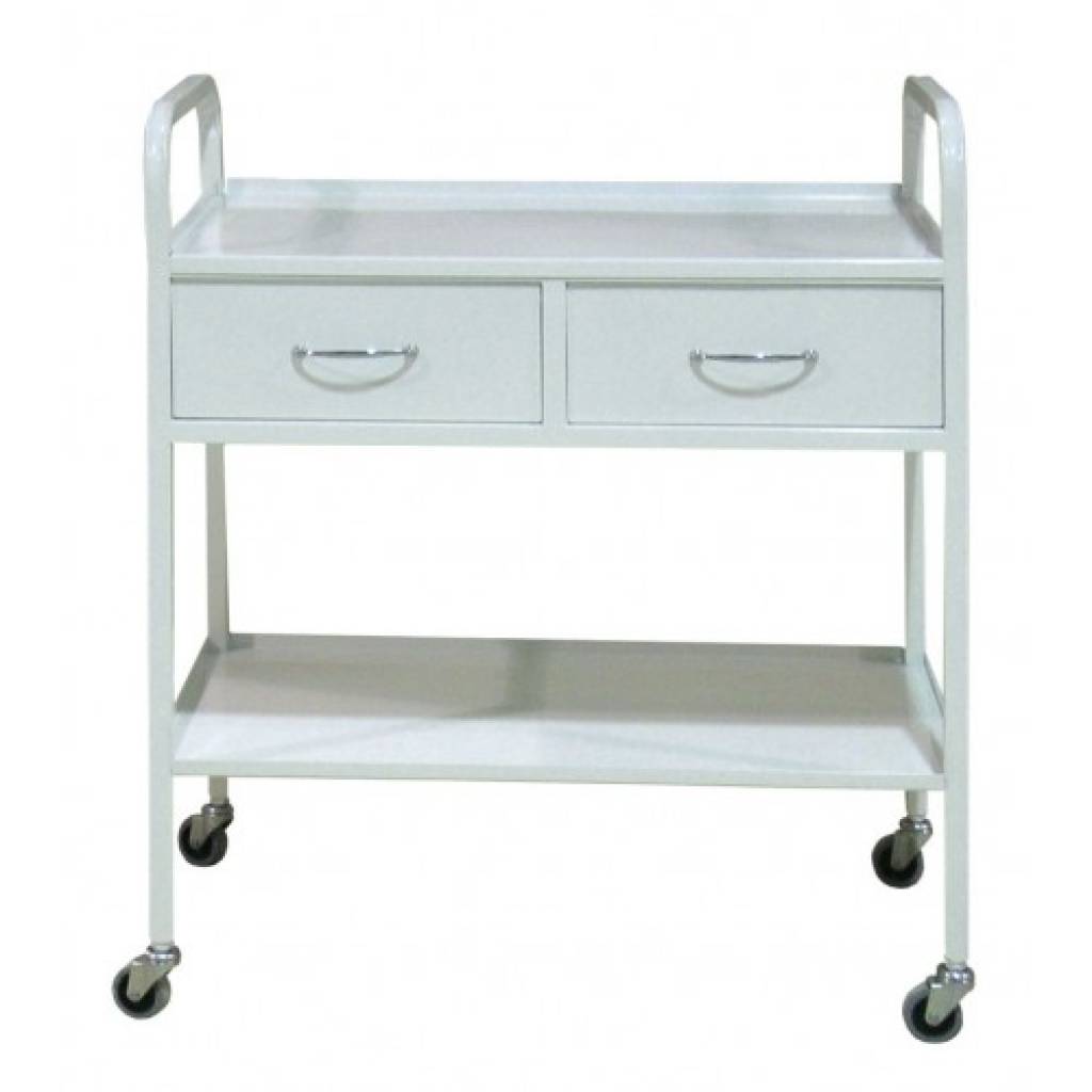 В верхней части 2 выдвижных ящика, в нижней металлическая полка. Столик установлен на 4 колеса d 50 мм. Все металлические поверхности имеют полимерно-порошковое покрытие. Столик поставляется в собранном виде.