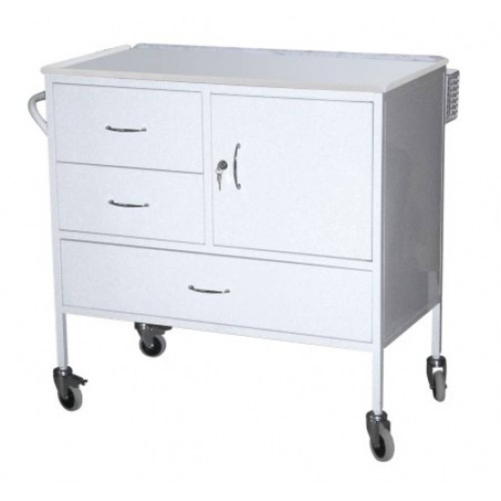 . В левой части 2 выдвижных ящика, в правой полка, закрытая дверцей. Внизу выдвижной ящик. Под столешницей со стороны ручки выдвижная полка, сзади перфорированная корзина. Столик установлен на колеса d 50 мм, 2 из которых с тормозом. Все металлические поверхности имеют полимерно-порошковое покрытие. Столик поставляется в собранном виде.