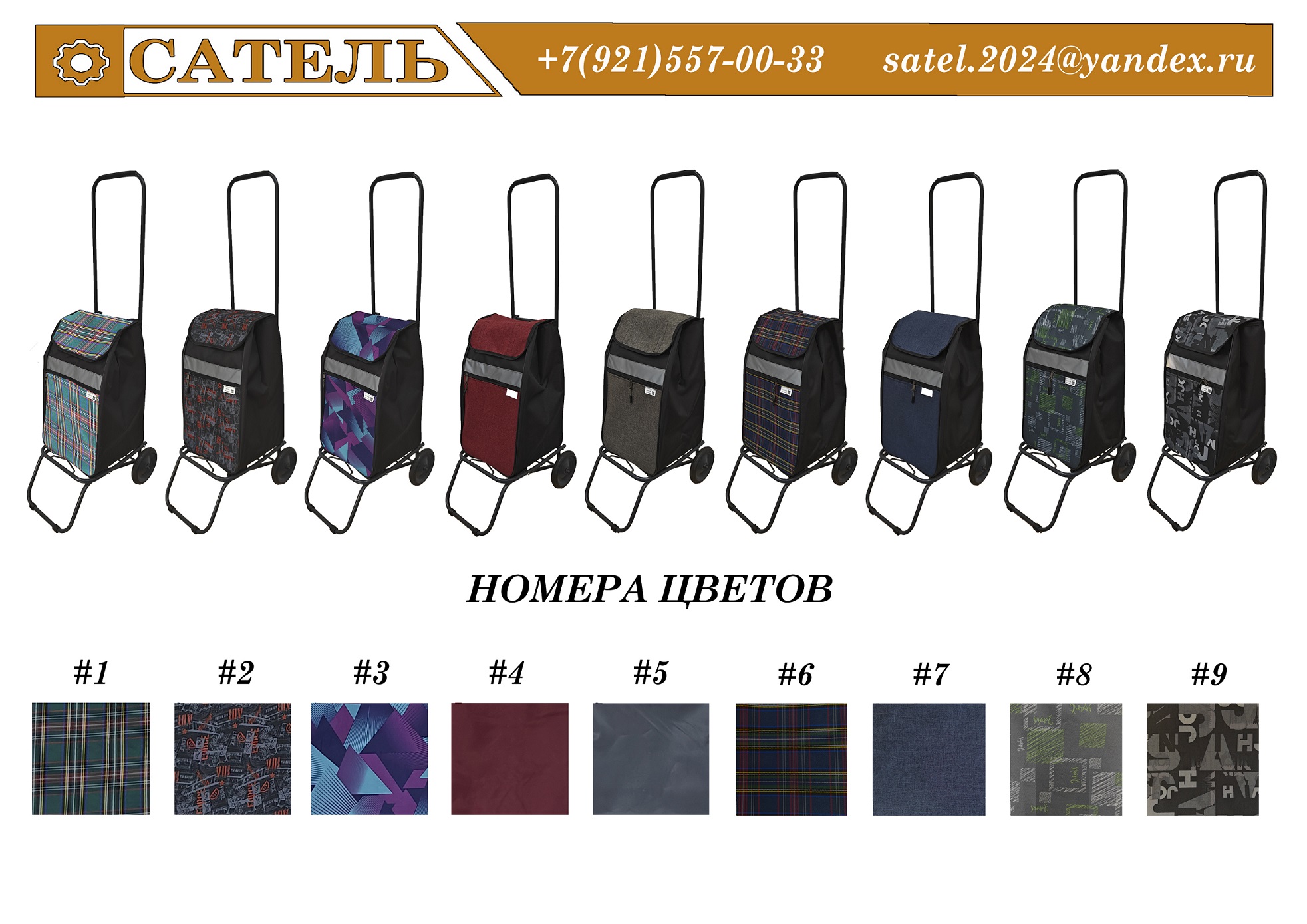 Сумки-тележки в ассортименте производит и реализует по оптовой цене российский производитель и поставщик компания «Сатель». В каталоге представлены сумки разнообразных расцветок. Предлагаем: сумки-тележки на металлических колеса; на пластмассовых колесах; с комбинированной сумкой. Приглашаем к сотрудничеству оптовых заказчиков, магазины и торговые сети, галантерейные магазины, дилеров. Специальные цены действуют при отгрузке более 500 шт. Условия продажи оптом и оплаты обсудим с заказчиками по телефону или пишите на email. Доставка по Санкт-Петербургу в пределах КАД транспортом компании, по России отправляем транспортными компаниями. При объемах от 3 млн. рублей готовы рассмотреть эксклюзивность в регионе.