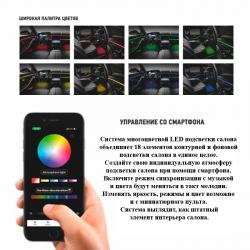 Система многоцветной LED подсветки салона объединяет 18 элементов контурной и фоновой подсветки салона в единое целое. Создайте свою индивидуальную атмосферу подсветки салона при помощи смартфона. Включите режим синхронизации с музыкой и цвета будут меняться в такт мелодии. Изменять яркость, режимы и цвет возможно и с миниатюрного пульта. Система выглядит, как штатный элемент интерьера салона.