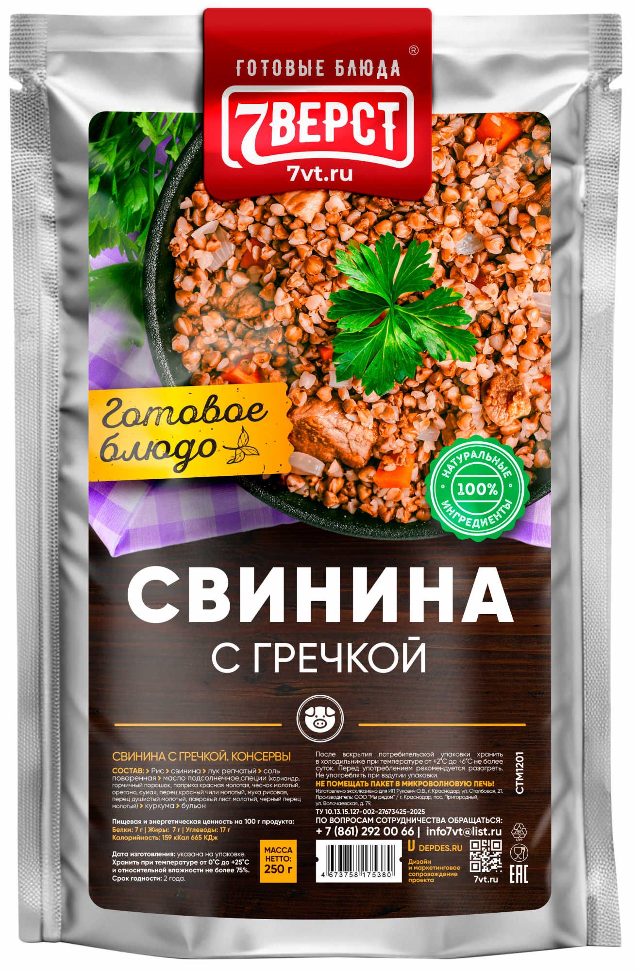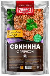 Гречка, свинина, лук репчатый сушеный, морковь свежая, соль поваренная, масло растительное, вода, специи (кориандр, горчичный порошок, паприка красная молотая, чеснок молотый, орегано, сумах, перец красный чили молотый, мука рисовая, перец душистый молотый, лавровый лист молотый, черный перец молотый).