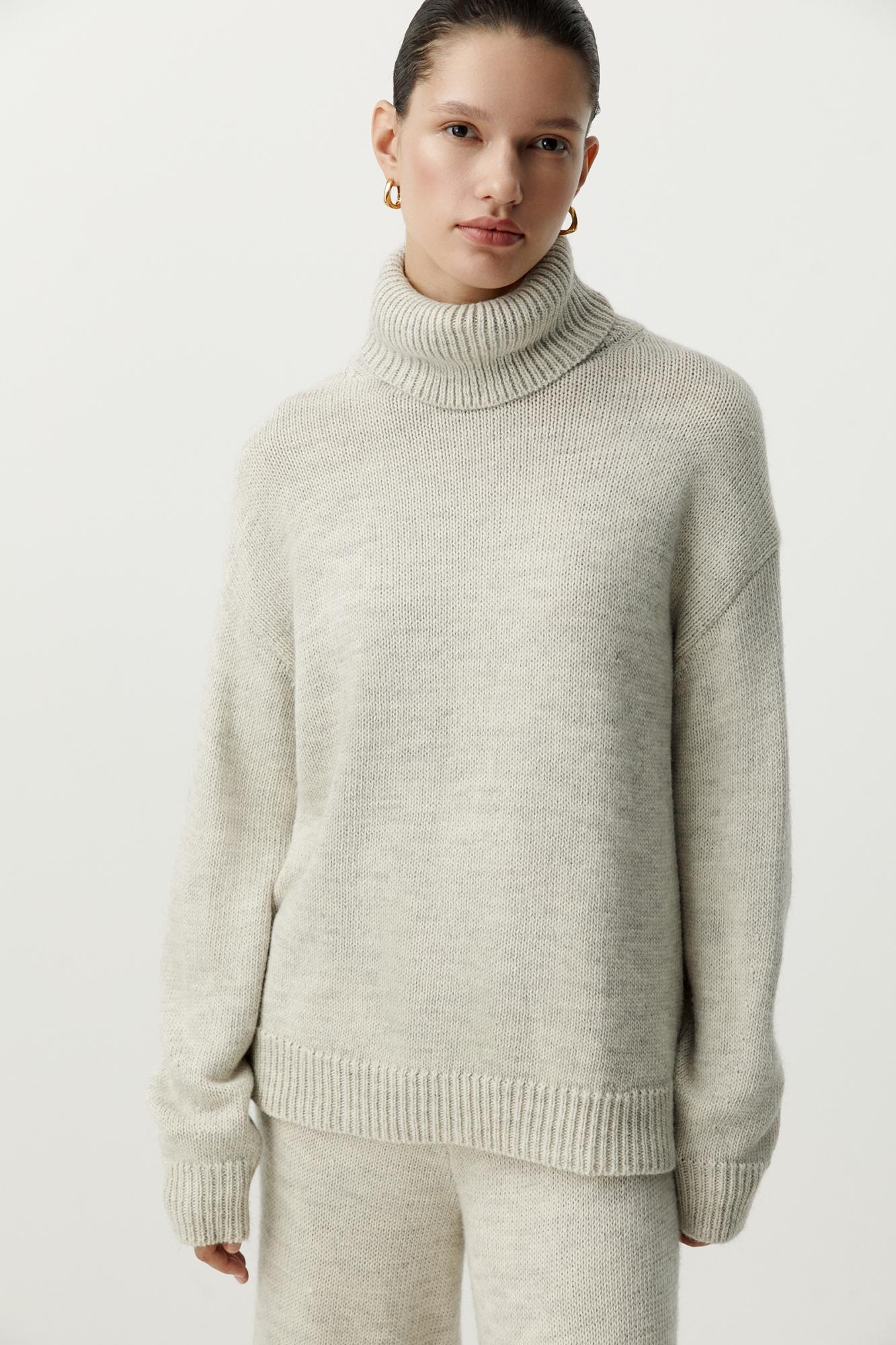 Базовый свитер прямого силуэта. Модель выполнена в плотной вязке, которая не продувается и позволяет сохранять тепло. Высокое объемное горло защищает в холодную погоду. Мягкая пряжа приятна телу и отлично держит форму. Высокие ластики по рукавам и низу защищают изделие от деформации и помогают дольше сохранить внешний вид.