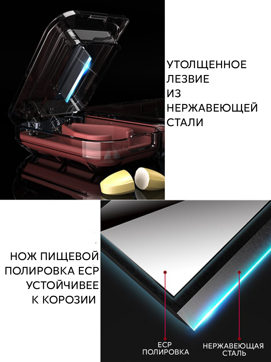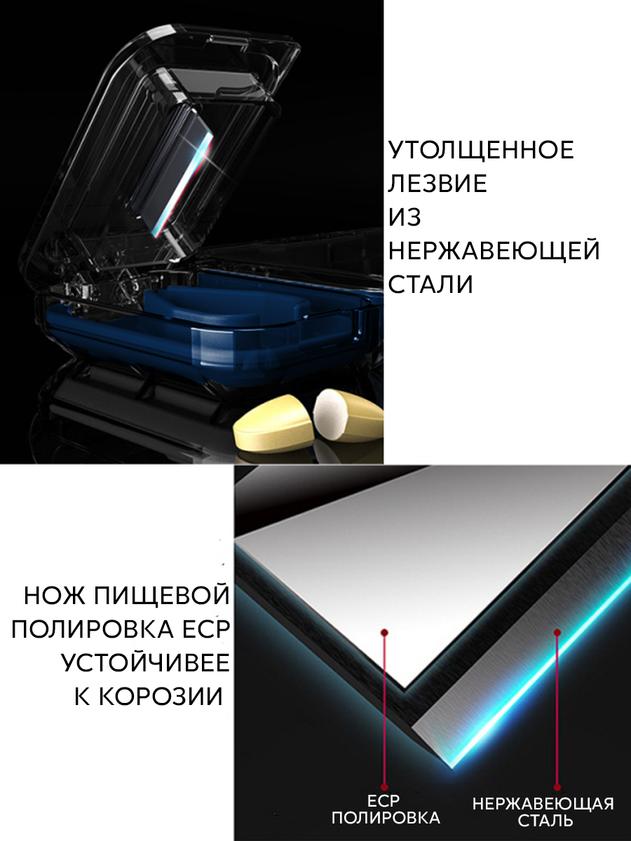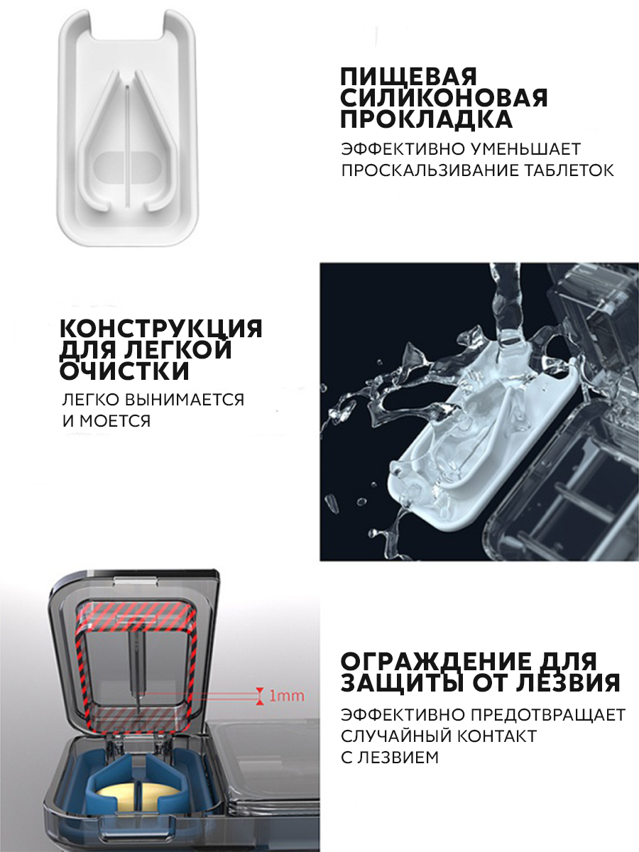 ТАБЛЕТНИЦА С РАЗМЕЛЬЧИТЕЛЕМ - коробка для таблеток имеет острый измельчитель. Любую пилюлю можно разделить таблеторезкой на 2 или 4 части, нож не крошит.