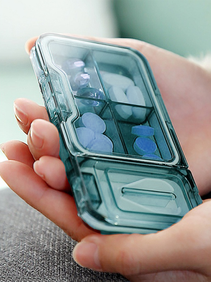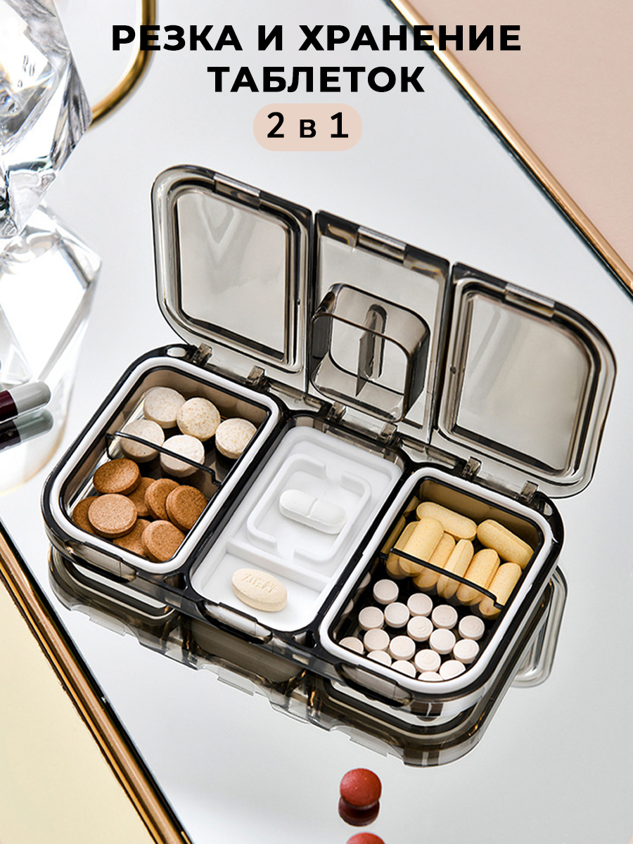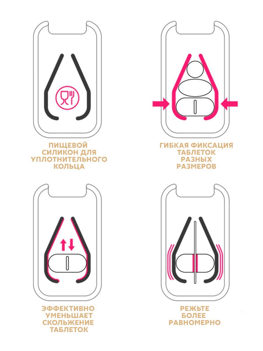 ТАБЛЕТНИЦА С РАЗМЕЛЬЧИТЕЛЕМ - коробка для таблеток имеет острый измельчитель. Любую пилюлю можно разделить таблеторезкой на 2 или 4 части, нож не крошит.