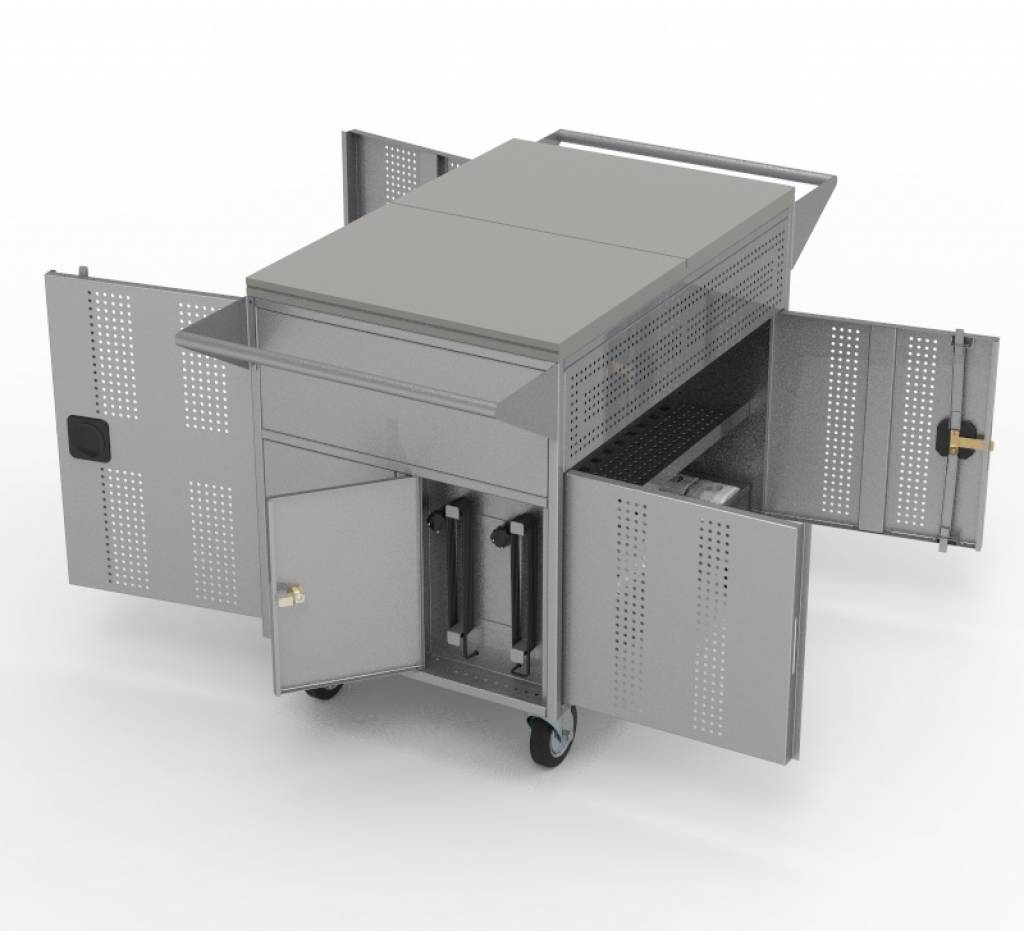 - Тележка оснащена дверями с замками: две с фасадной стороны и две с задней стороны, одна дверца сбоку, за которой расположены два кабеля с вилками.