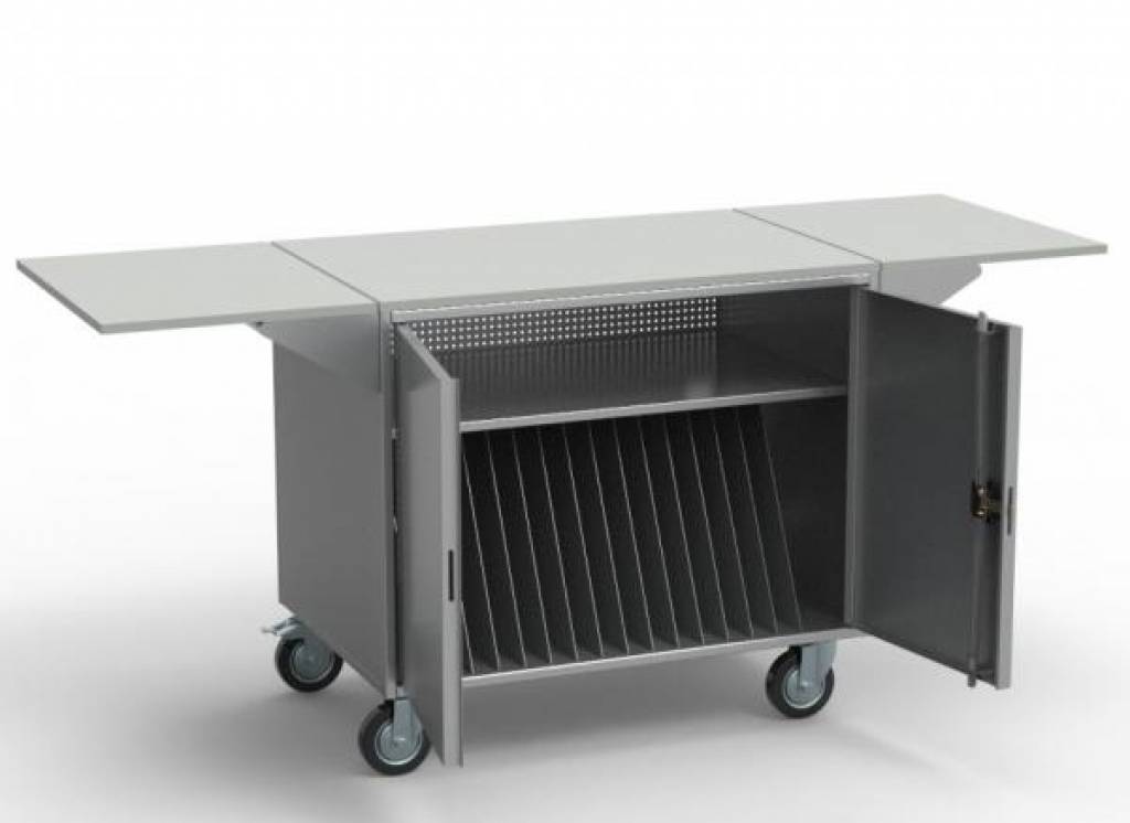 нтернет-магазин предлагает купить тележку для хранения и зарядки ноутбуков. Модель НБ-16 предназначена для хранения и доставки в студенческую аудиторию или школьный компьютерный класс шестнадцати ноутбуков и акцессуаров к ним (предусмотрена ниша блока питания для подзарядки, сетевого фильтра и т.п.). Верхняя часть является раскладной и легко может трансформироваться в рабочее место для преподавателя, где можно разместить принтер, сканер и другую аппаратуру. Мы напрямую работаем с производителями металлической мебели для учебных заведений, поэтому цена тележки хранилища ноутбуков – всегда доступная.