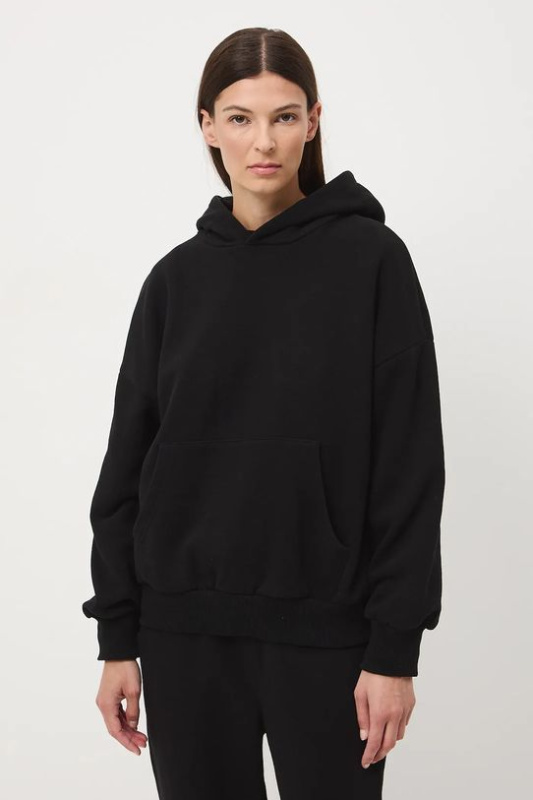 Женская толстовка. Крой oversize. Длинные рукава. Спущенная линия плеча. Модель с капюшоном. Практичный прорезной карман-кенгуру спереди.
