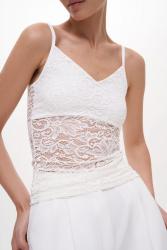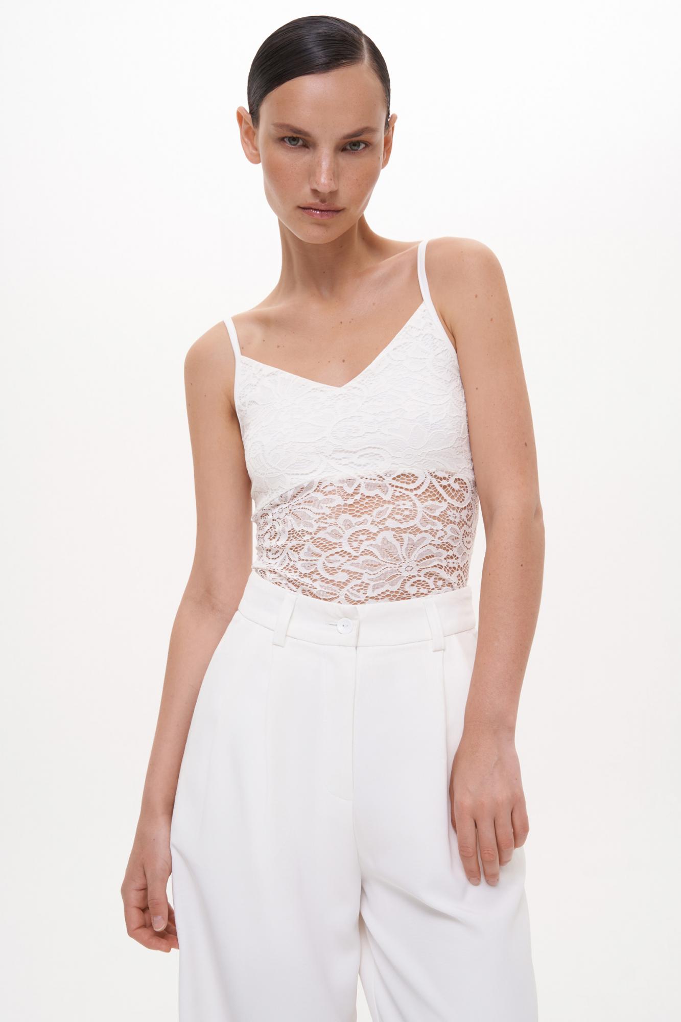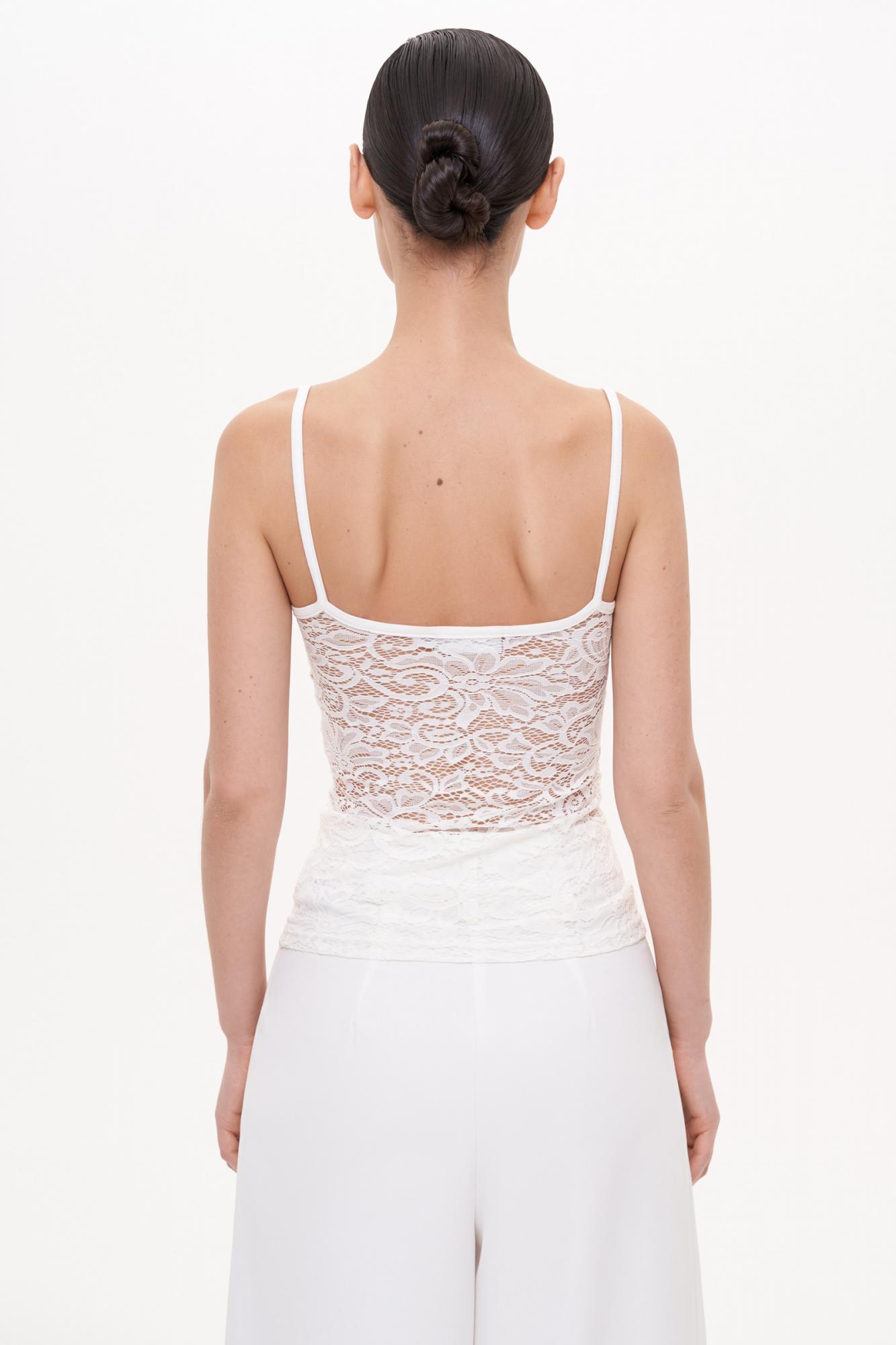 Полупрозрачный топ из кружева в облегающем силуэте. Для большего комфорта мы оформили топ подкладкой по лифу в цвет кружева. Модель выполнена на тонких бретелях с V-образным вырезом, который подчеркивает линию ключицы.