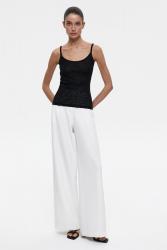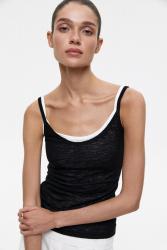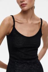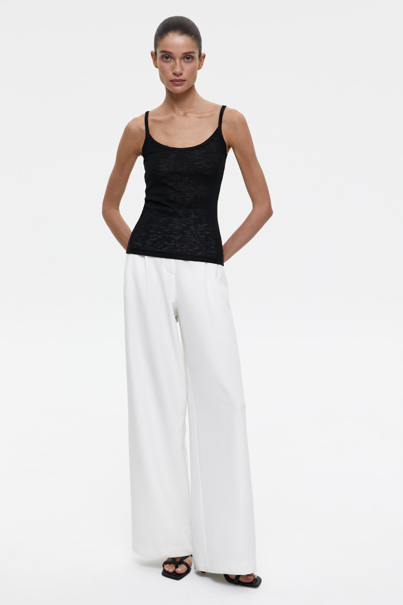 Топ на тонких бретелях полупрозрачного трикотажа. Модель выполнена в свободном крое с глубоким вырезом спереди. Ткань изделия приятна и практически не ощущается на теле.