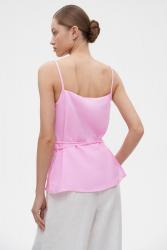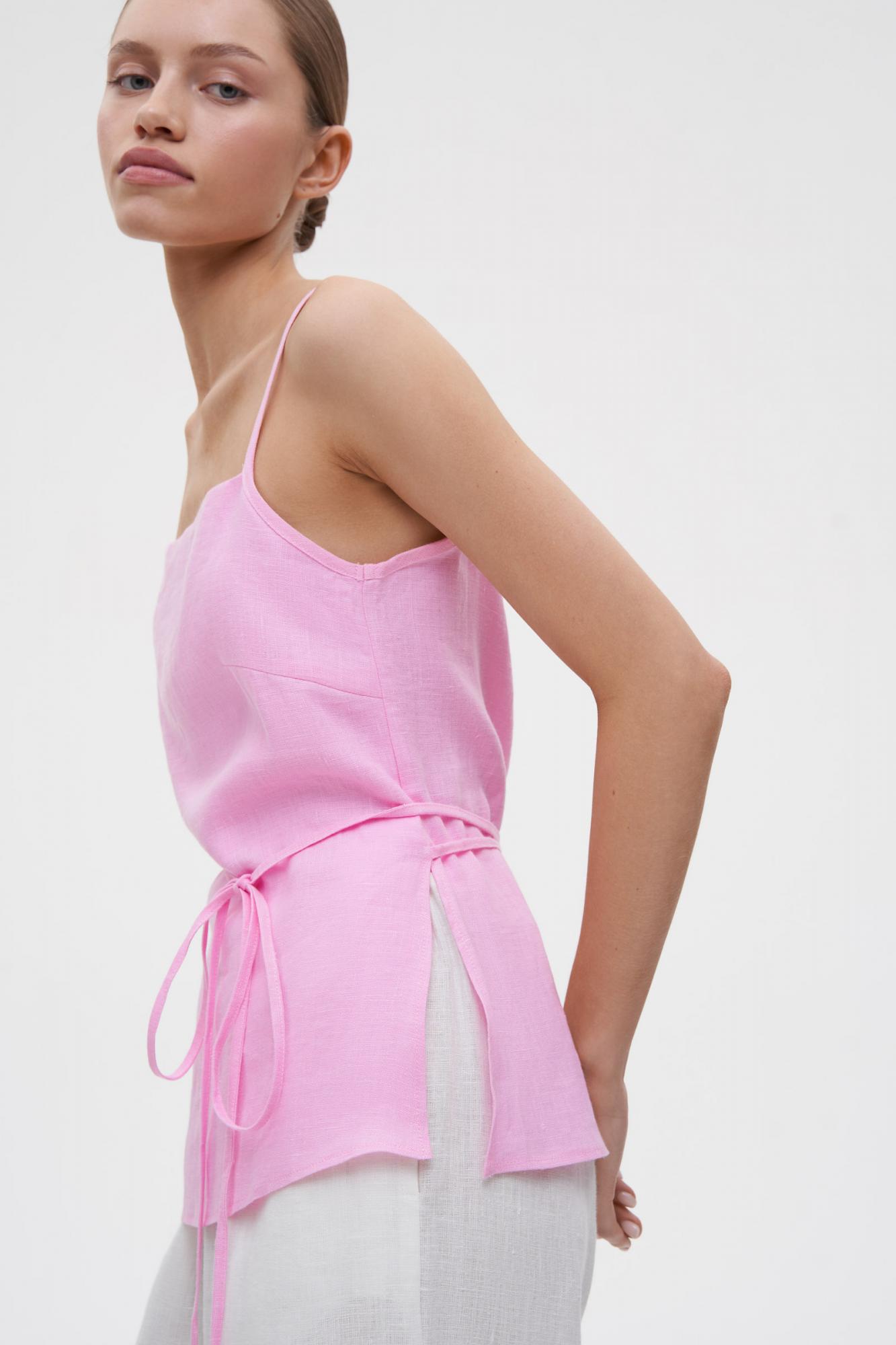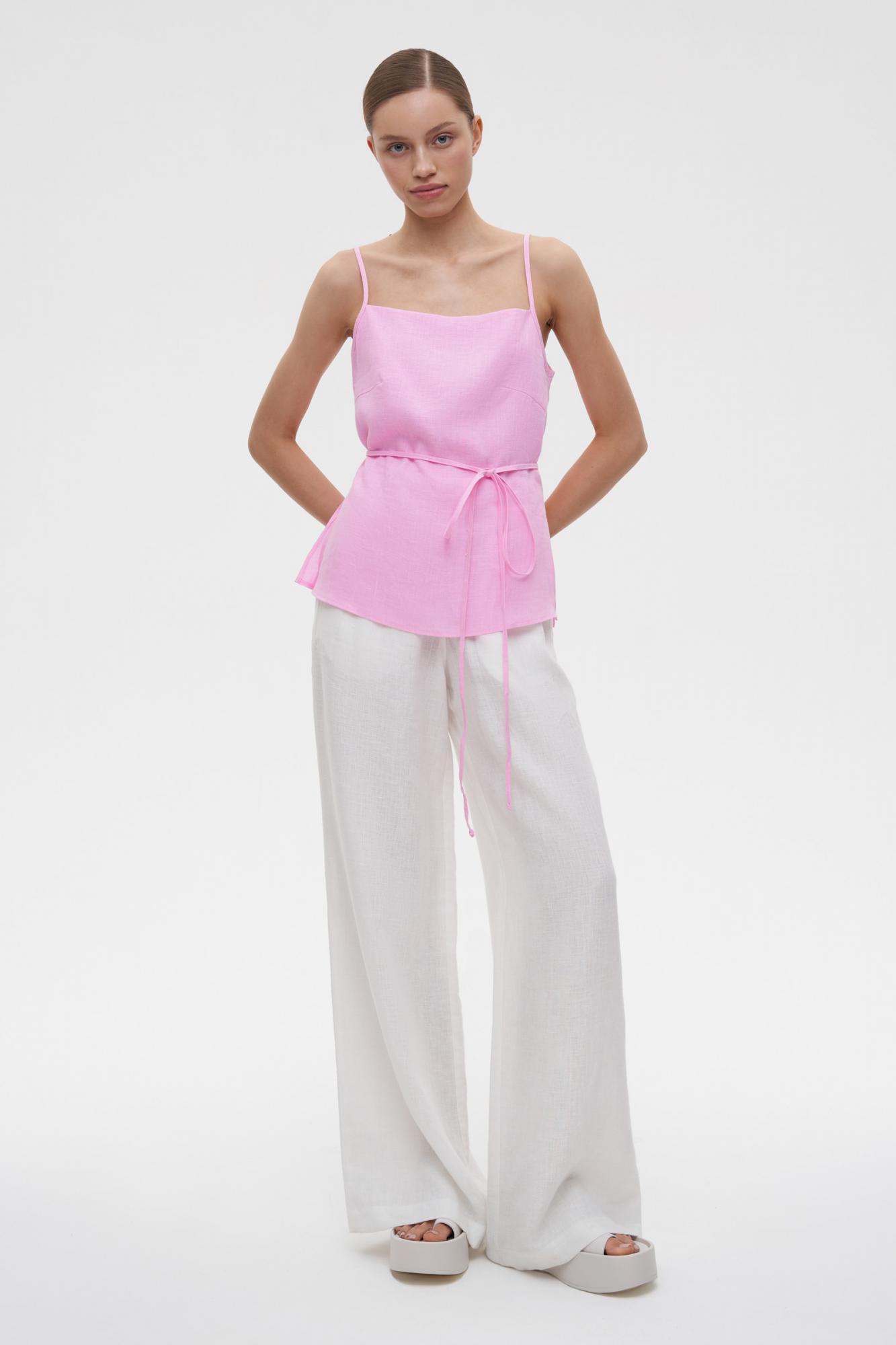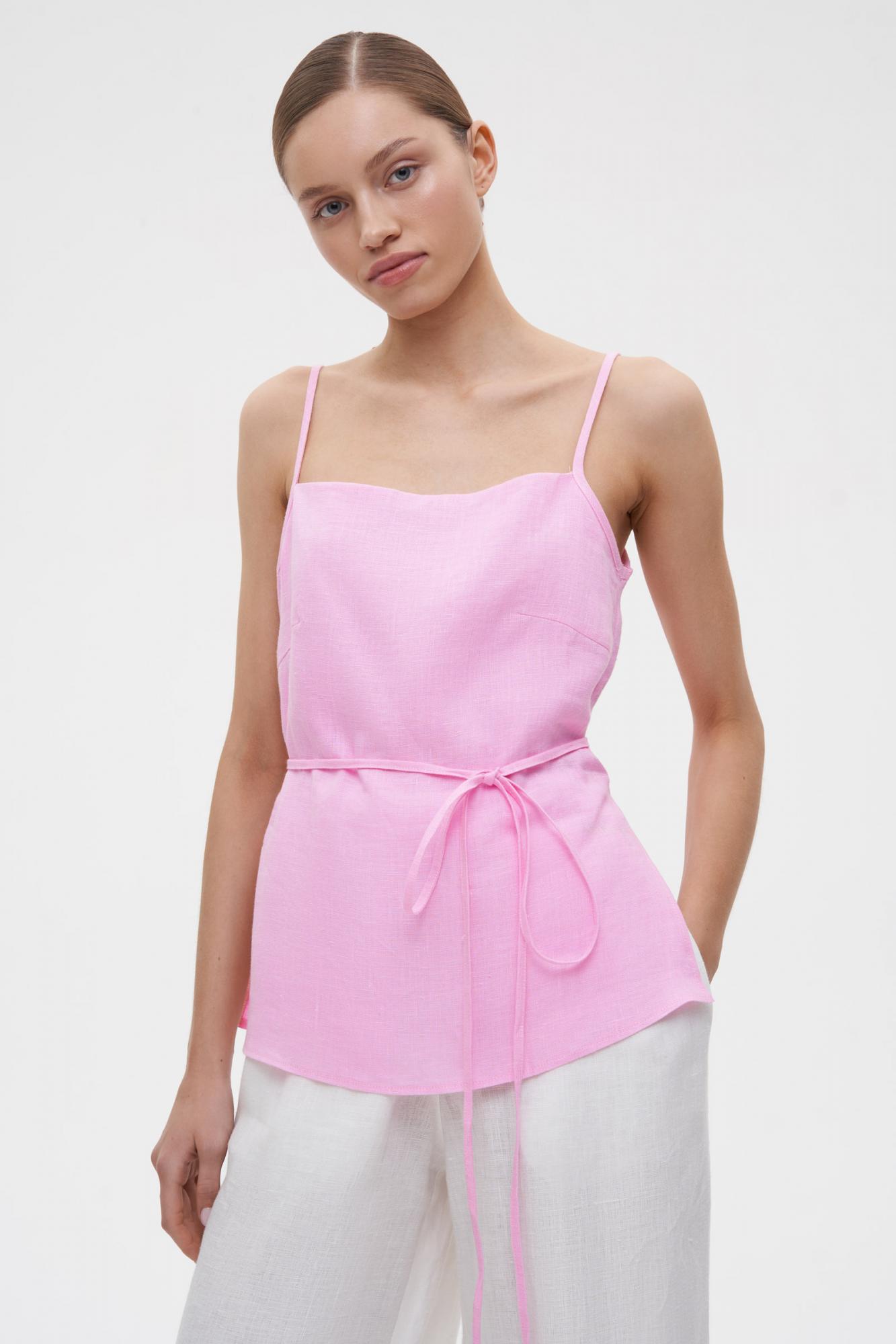 Аккуратный и женственный топ изо льна на тонких бретелях. Квадратный вырез спереди и по спинке делают изделие еще более лаконичным. Тонкие пояса на уровне талии создают идеальный и точный силуэт песочные часы. Особой нежности топу добавляет легкая ткань. Необходим бережный уход.