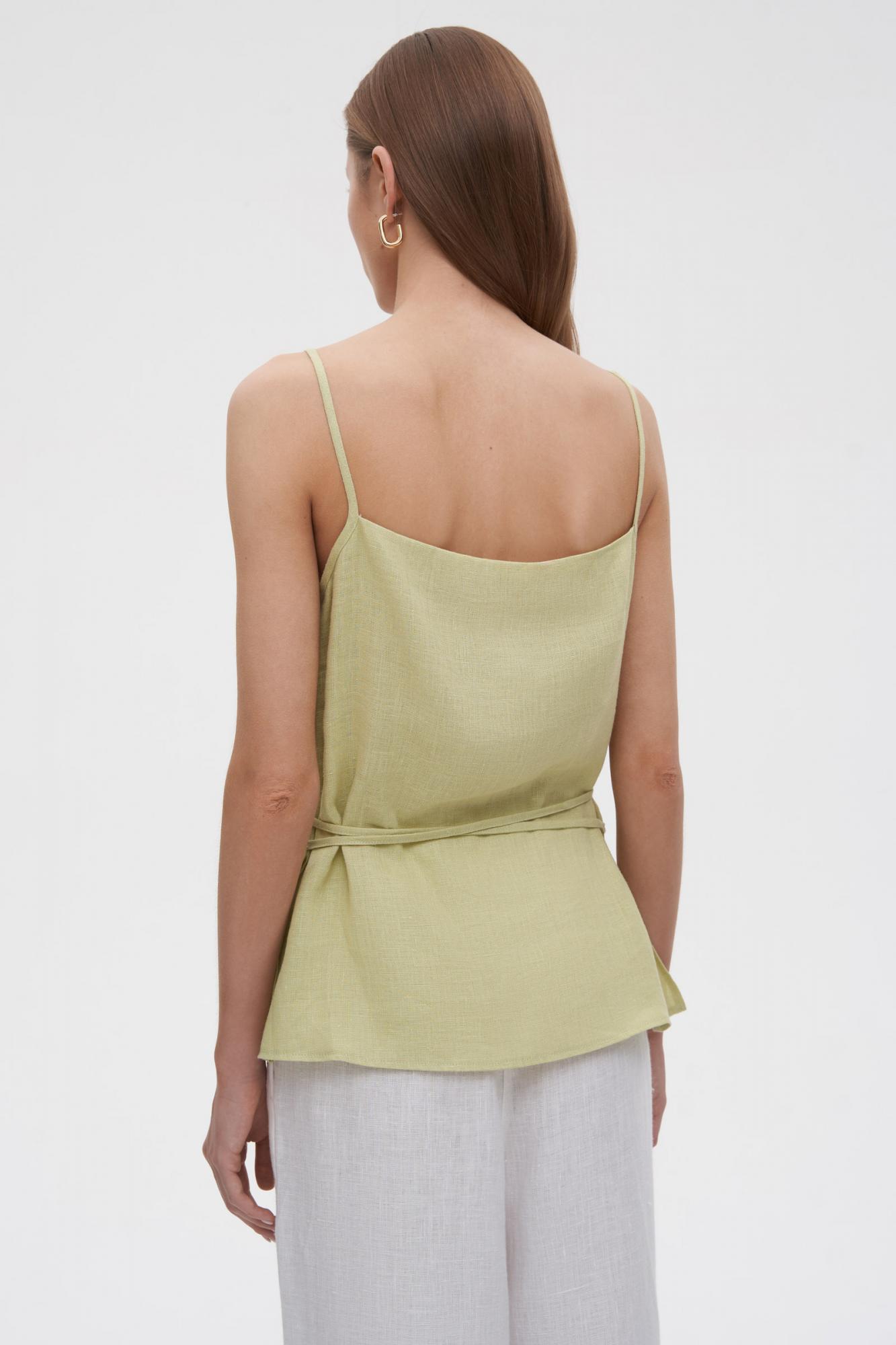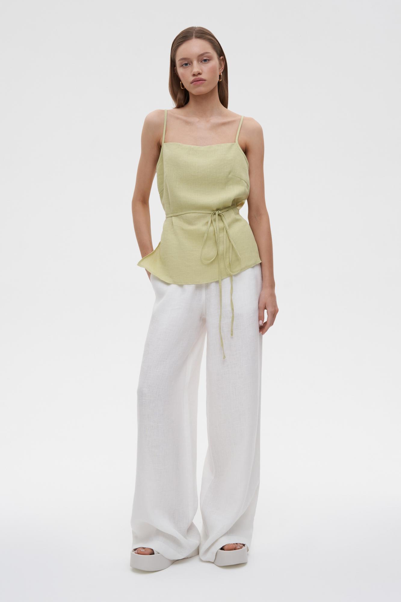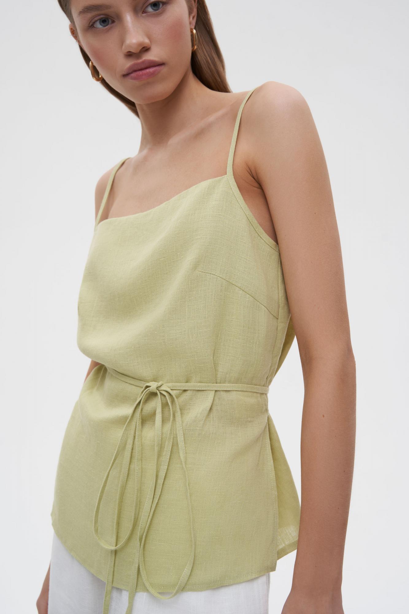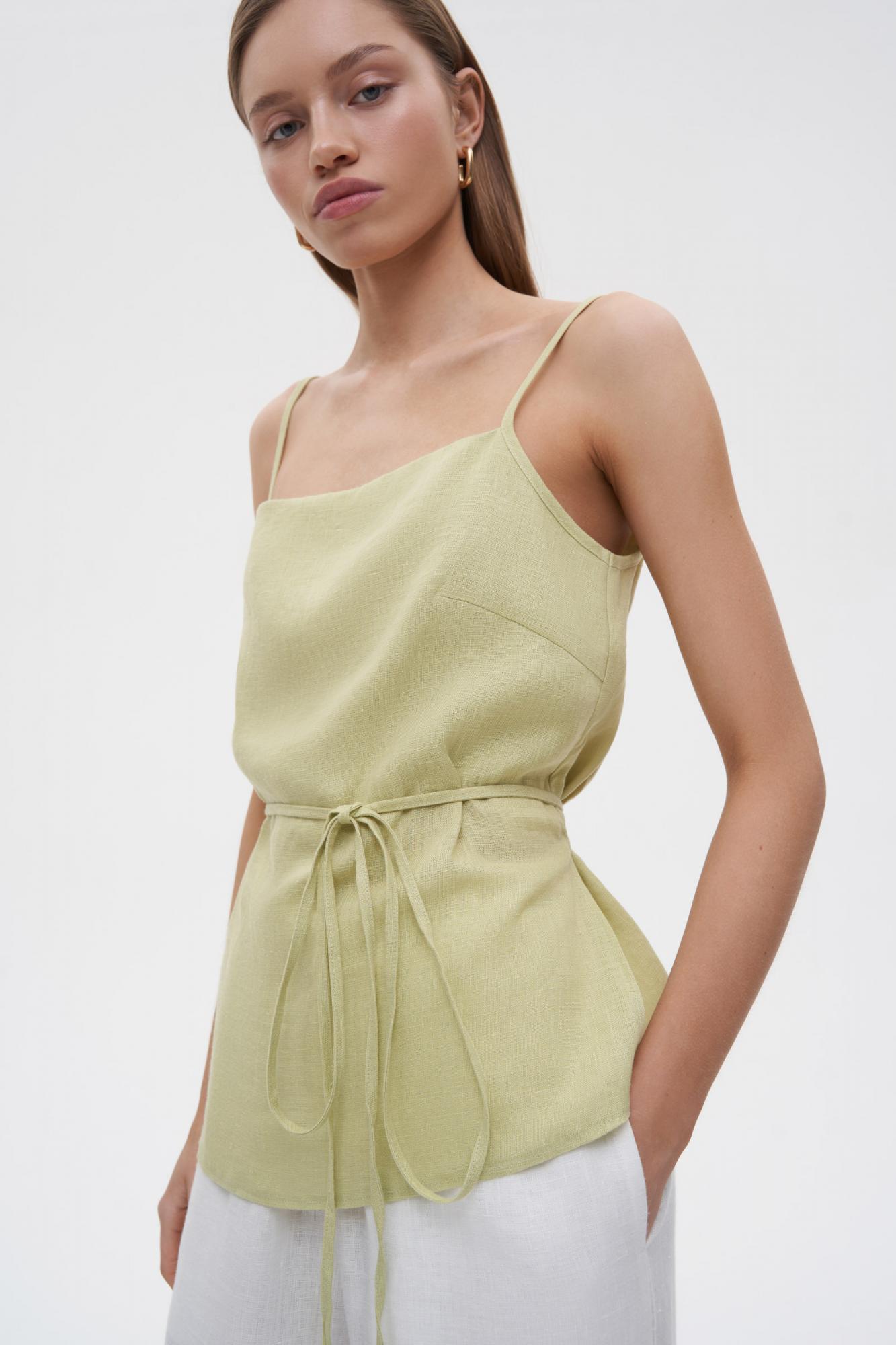 Аккуратный и женственный топ изо льна на тонких бретелях. Квадратный вырез спереди и по спинке делают изделие еще более лаконичным. Тонкие пояса на уровне талии создают идеальный и точный силуэт песочные часы. Особой нежности топу добавляет легкая ткань. Необходим бережный уход.