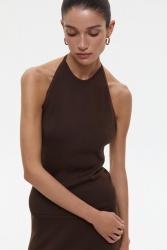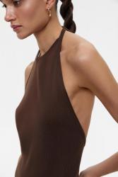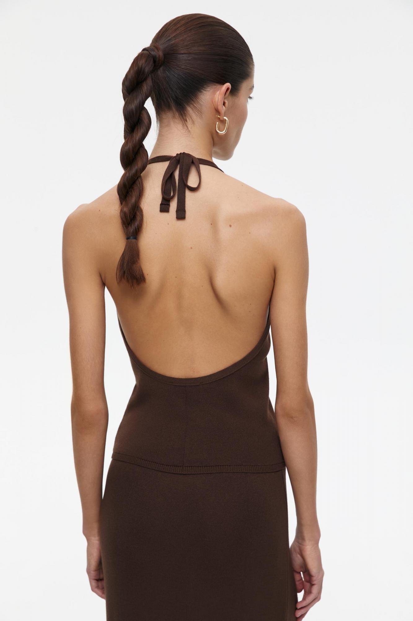 Вязаный топ халтер на завязках с открытой спиной. Модель выполнена в женственном облегающем силуэте и делает акценты на линии груди и талии. Для большего комфорта мы оформили изделие тонкими ластиками.