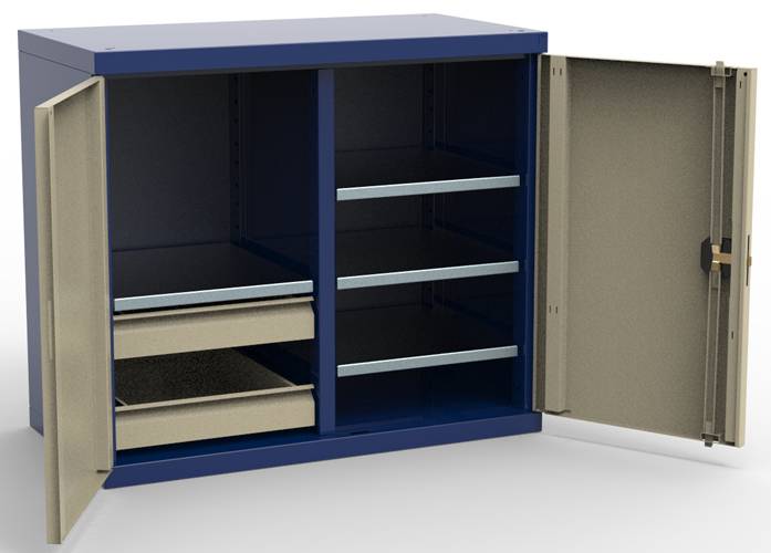 - Двухсекционный шкафчик с перегородкой, четырьмя переставными полками (шаг 50 мм) и двумя выдвижными ящиками на телескопических направляющих с фиксатором от выкатывания