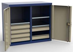 - Двухсекционный шкафчик с перегородкой, тремя переставными полками (шаг 50 мм) и шестью выдвижными ящиками на телескопических направляющих с фиксатором от выкатывания