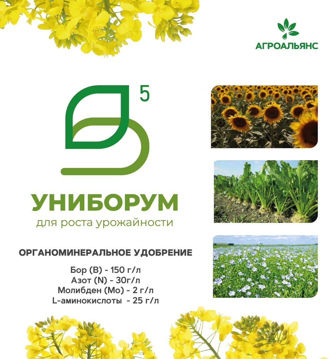 “Униборум” (В 150 г/л) - органоминеральное удобрение, восполняющее дефицит Бора, напрямую влияющего на урожайность сельскохозяйственных культур. В отличие от внесения высококонцентрированных борных удобрений в грунт, внесение по листу позволяет достичь лучшего эффекта значительно меньшими дозами удобрения.