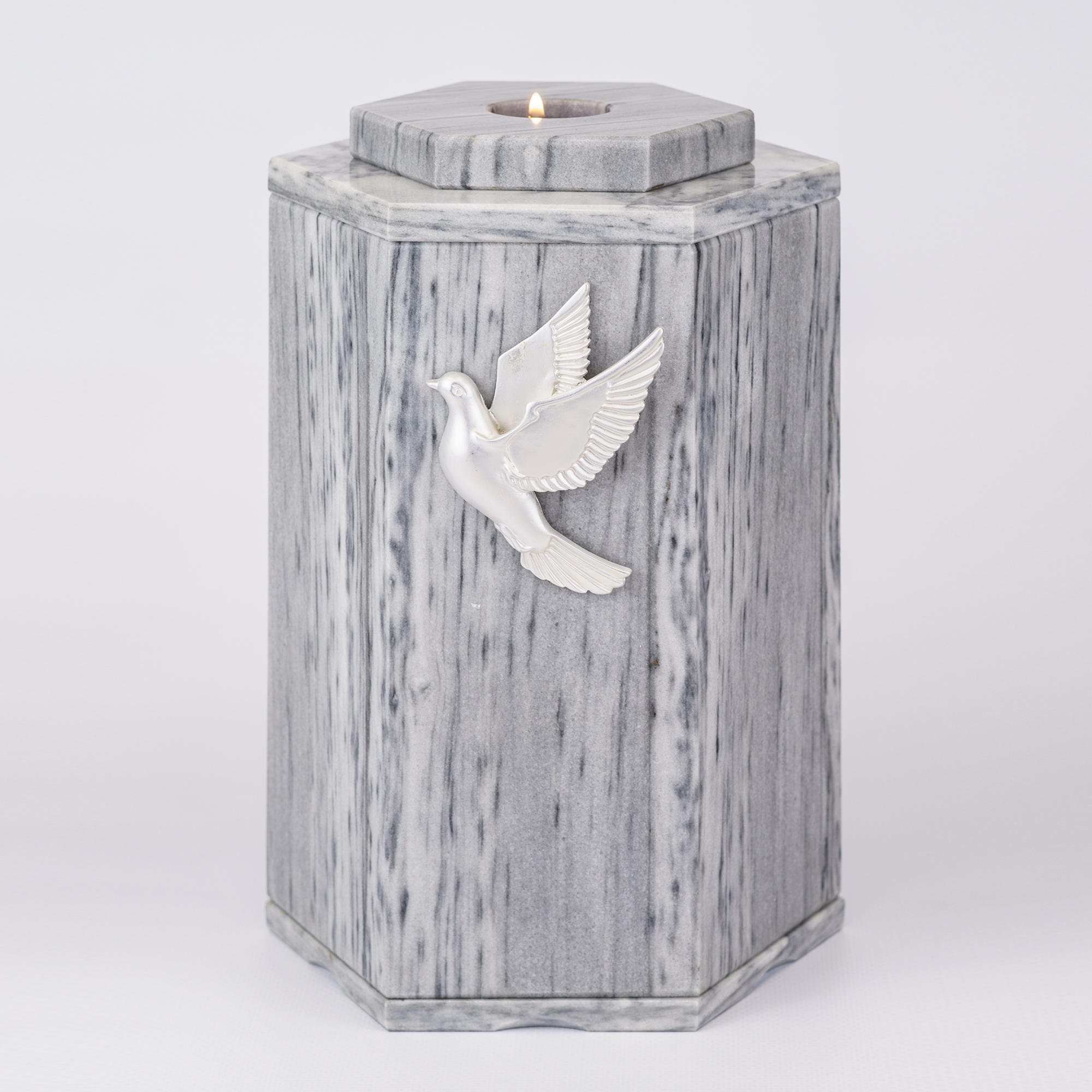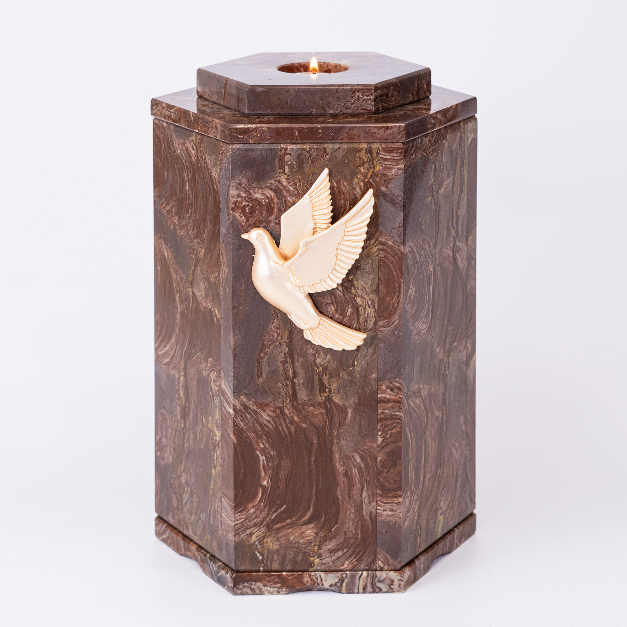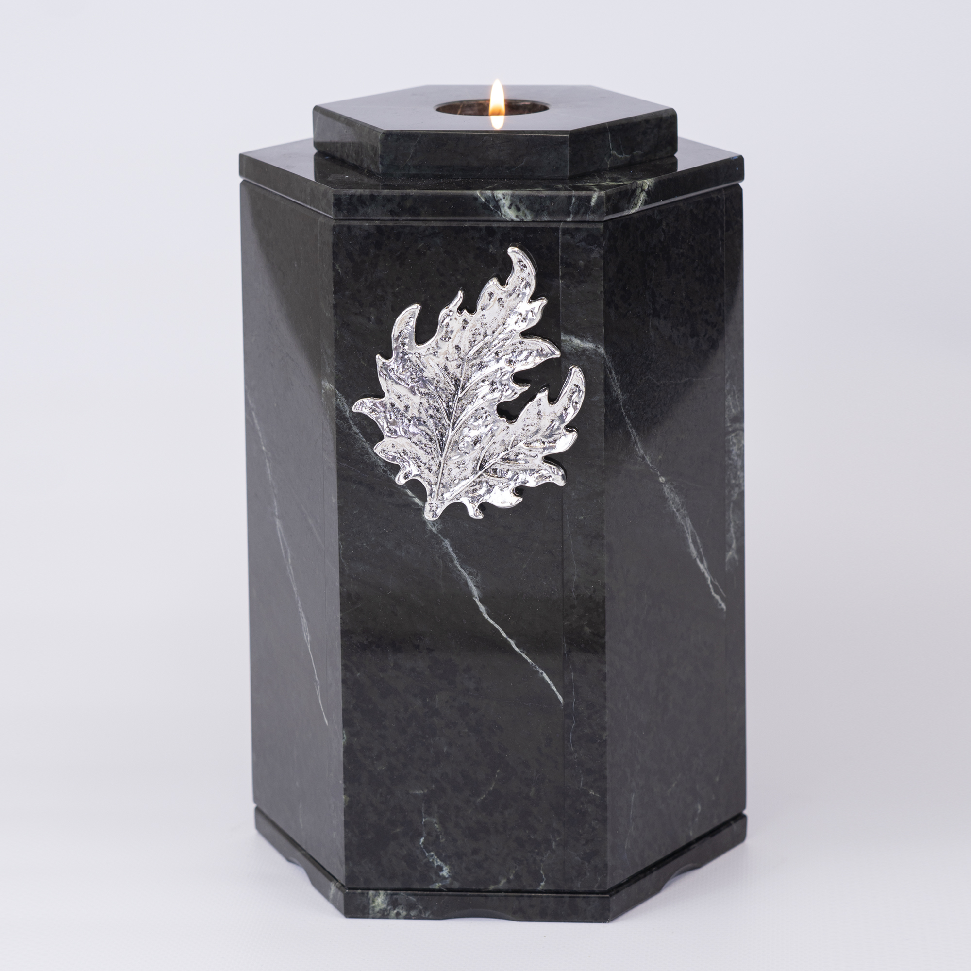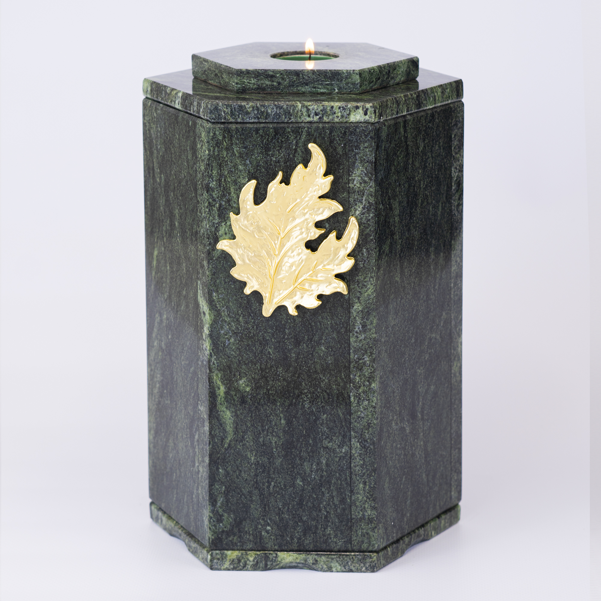 Урна для праха из камня (змеевик, доломит, мрамор) в форме шестигранника.